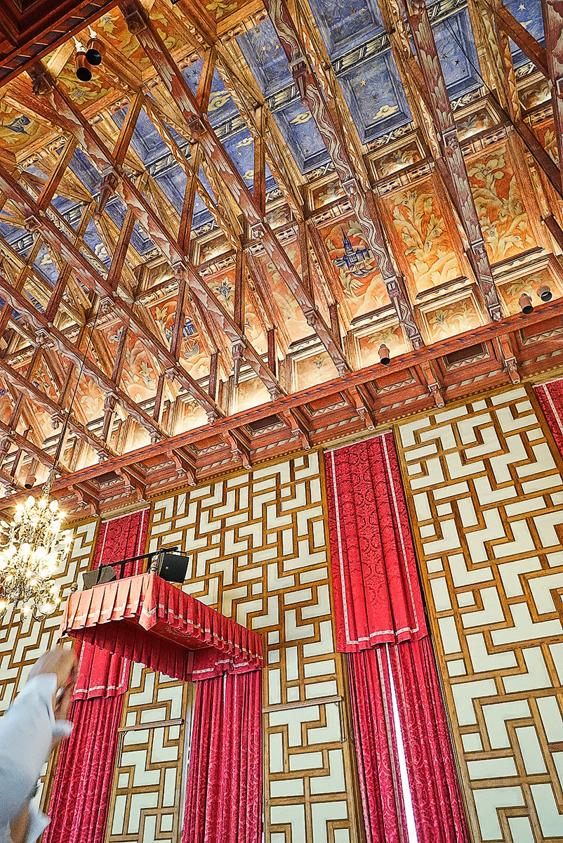 下图是市政厅的议会大厅,它最具特色且最漂亮的是大厅的内船形屋顶。