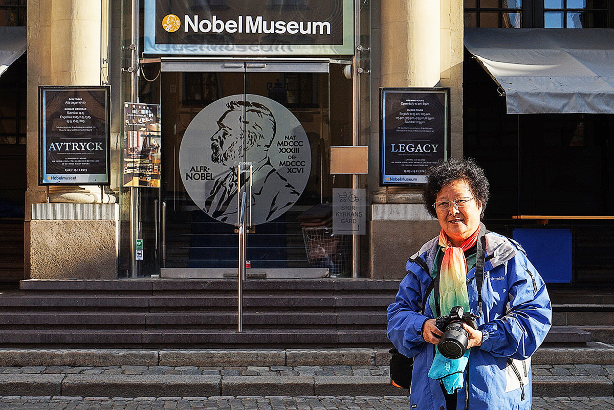 瑞典 斯德哥尔摩老城的“诺贝尔博物馆 ”的门口,老姐在此留念。