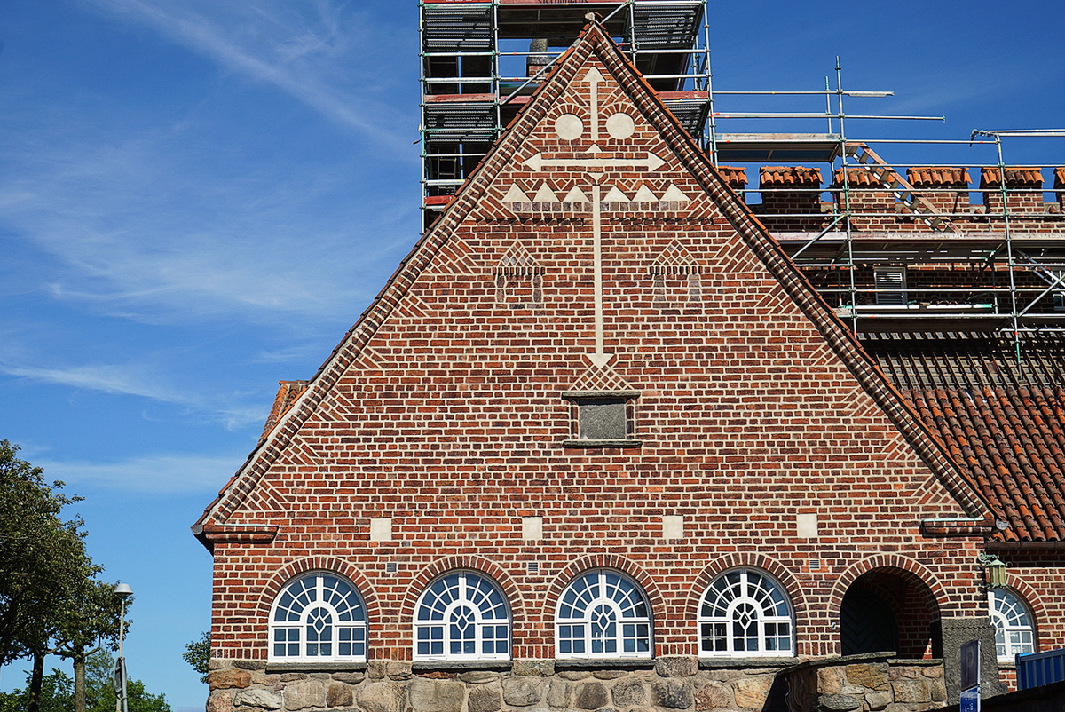 丹麦 赫尔辛格 码头边,码头装载器械也被作为雕塑放在这里,和后面蓝天白云下色彩鲜艳的房屋和教堂,展现着 赫尔辛格 这座小城的特色。