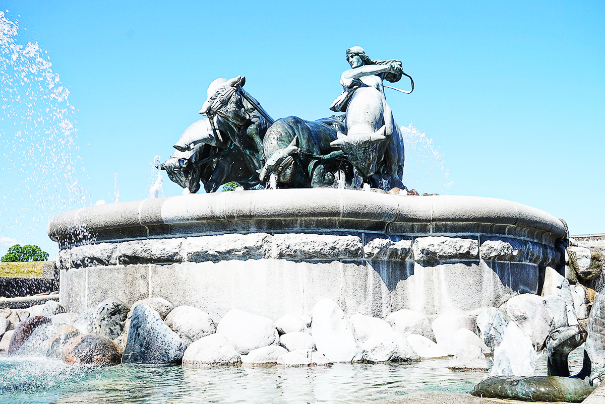 吉菲昂女神喷泉雕塑。它是 丹麦 最雄伟、壮观 和美 丽的巨型铜雕。在一个花环形的水池中央,竖立起一座巨大的圆石墩,石墩底部的四周喷射出瀑布似的泉水。铜雕依坡就势而建,最上面的是吉菲昂女神。女神左手扶犁右手挥舞着长鞭,发辫在疾风中扬起,面部表情显得十分刚毅果敢。她驾驭着的四头巨大而健壮的神牛,奋力耕耘。下面是有三层落差的花岗岩水池。整个铜雕栩栩如生,极有力量和生气。使你感到一种摄人心魄的力量。