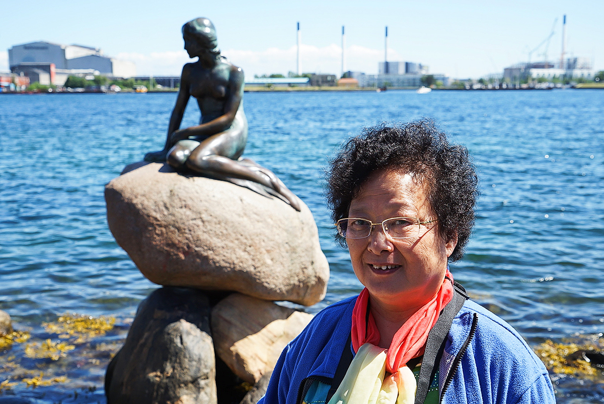 巨大的岩石上,那尊世界闻名的“美人鱼”铜像。 这是 丹麦 雕塑家艾里克森于一九一三年根据安徒生的童话故事《海的女儿》塑造的。游人们纷纷与它合影。