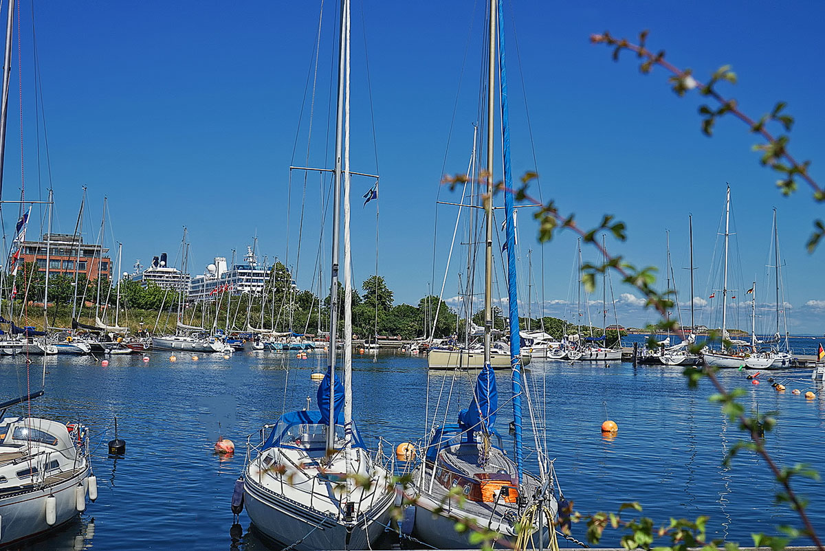 小美人鱼铜像旁一个游船码头,停靠着许多私人游艇。