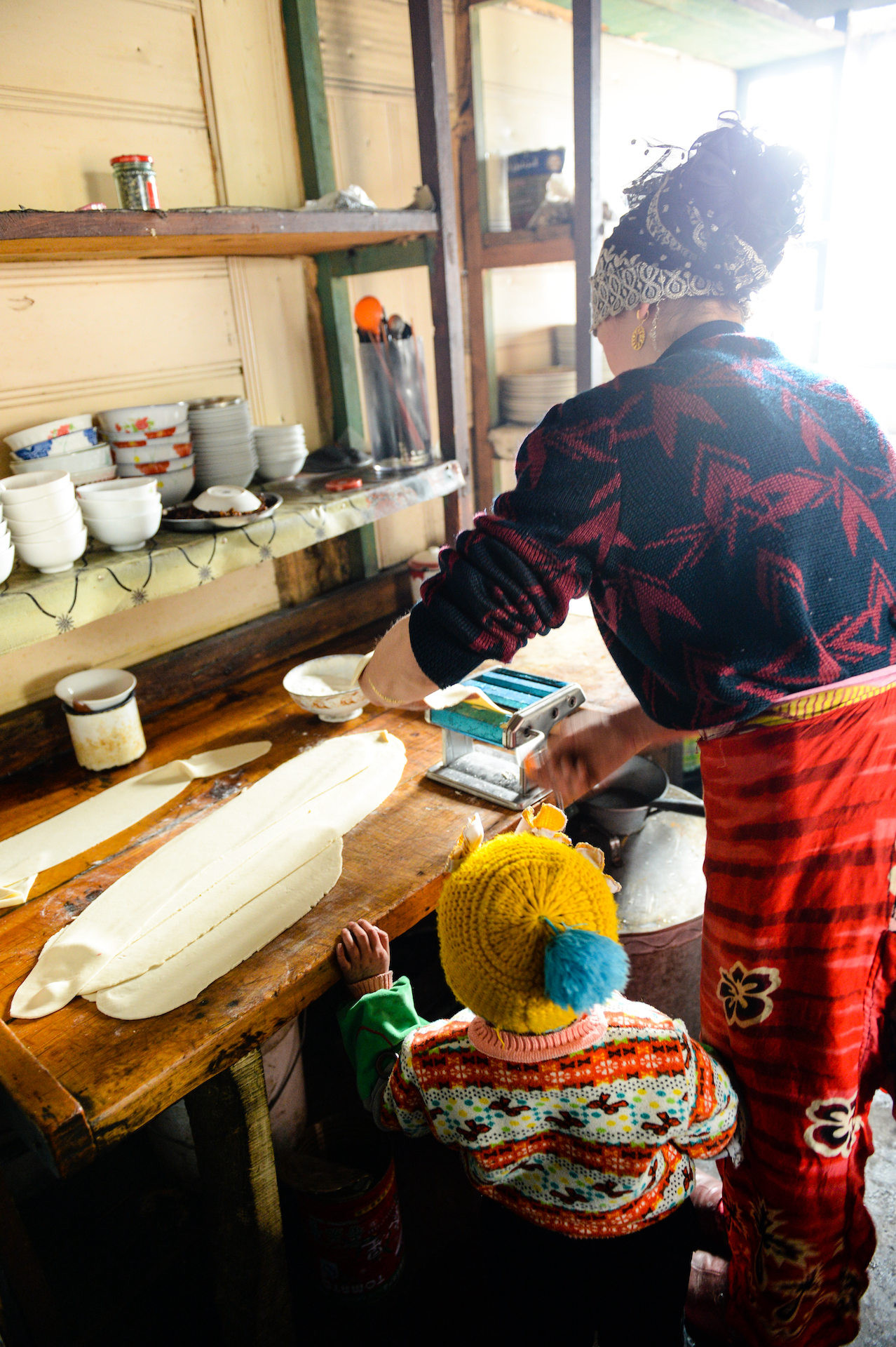 令人遗憾,诱人的南疆之行只能留待下次完成。寒冷的天气里,我们聚集在山下小镇的小餐馆里等着羊肉那仁出锅。小姑娘乌斯丽曼成为了我们的焦点,这个漂亮的小姑娘从腼腆害羞到和我们打成一片再到开始有些炫耀般地展示她的花帽子和围巾,几乎只用了几分钟的时间。