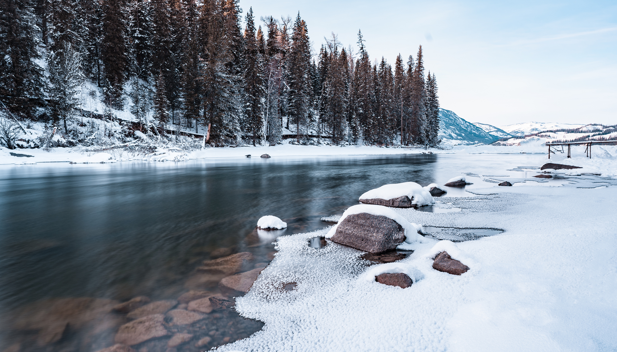 喀纳斯的湖水绿的独一无二,下游湖水波光粼粼,像闪烁着星星。在阳光的照射下,绿色清新透亮,湖水大部分都已经结冰,穿上厚厚的雪衣,只露出一条狭长的“缝隙”,尽管如此,湖水依旧按照自己的速度没有停留,有着一种涌动的力量向前奔赴! 上游湖水却平静的像一面镜子,倒影着天空的蓝和雪地的白,温柔优雅。这样的喀纳斯,犹如一张张明信片放映,美的不可方物。