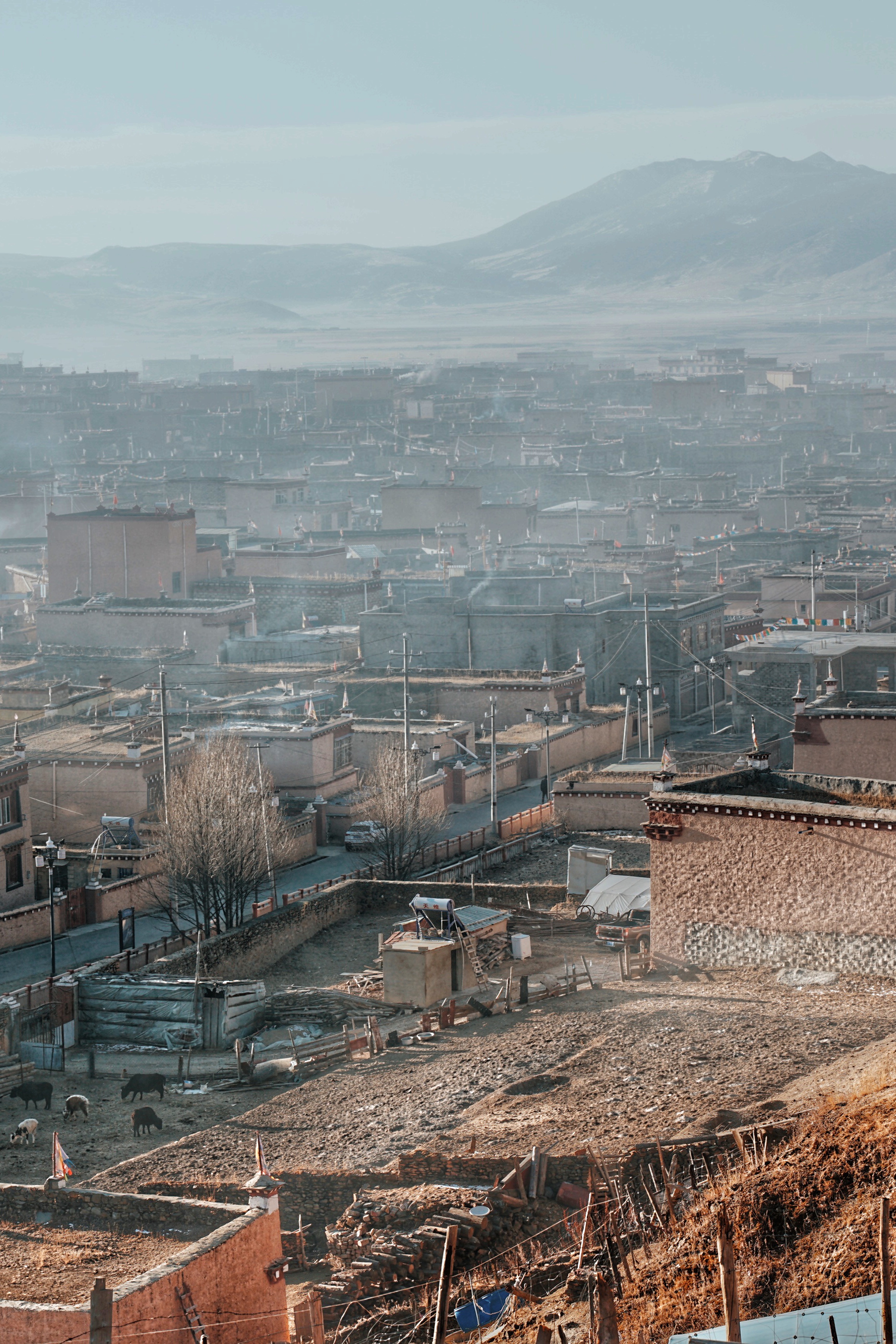 攀登过半,我们回过头看,马上被眼前这景致震撼了心灵。藏族特色的房子在晨光与迷雾中充满了神秘感,袅袅的炊烟又让整座城市有了生命力。