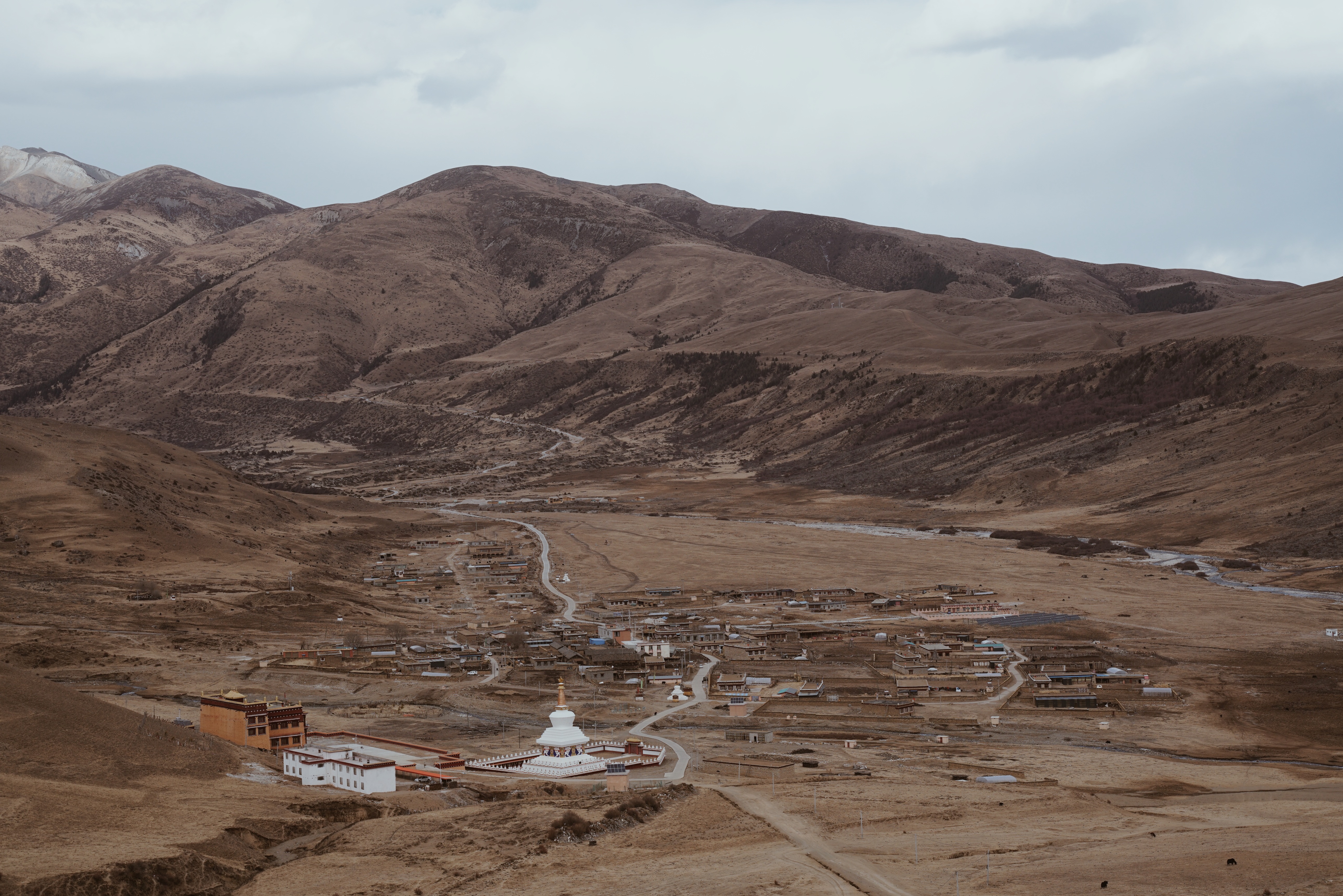 走走停停也终于到达了位于长青春科尔寺后山坡的顶部了,视野尚可,金色的晨光搭配着大片大片藏族特色建筑,一眼万年。