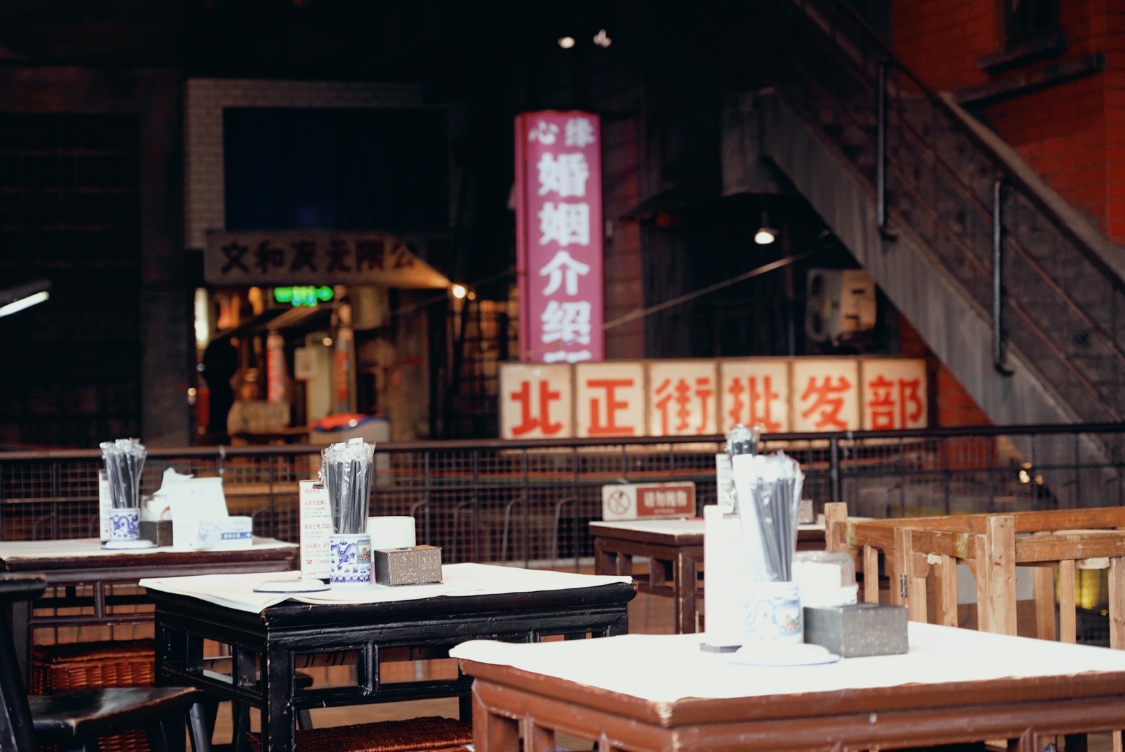 超级文和友的正门口是姐妹花服装店,你可以穿着复古的衣服在里面吃饭,享受沉浸式的吃饭乐趣。