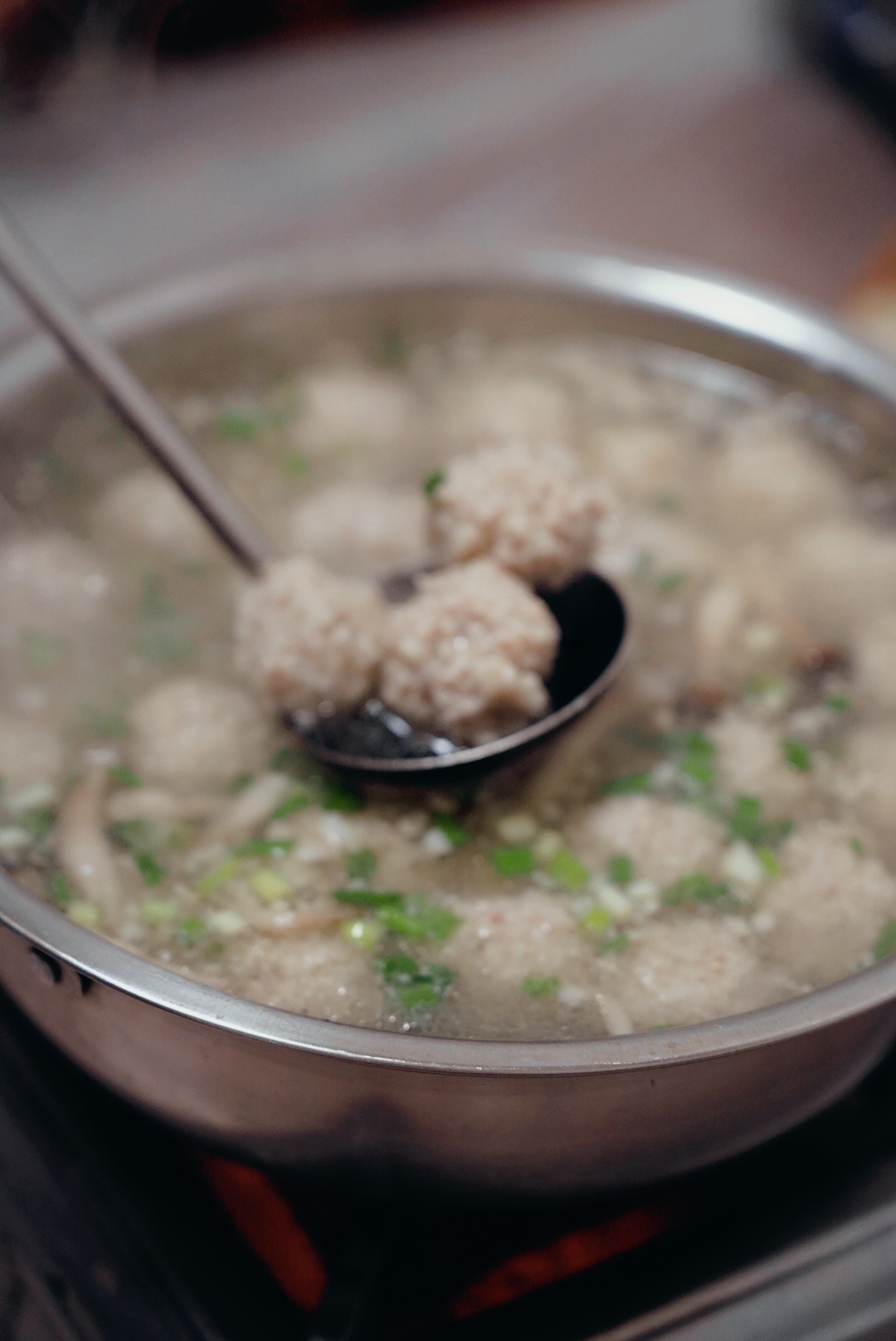 手工剁了3个多小时的肉捏成肉丸,然后再配上熬制6个多小时的猪大骨汤,最后煮一点菌菇,让菌香味潜入汤汁,渗入肉中,整锅就是个香味大满贯。