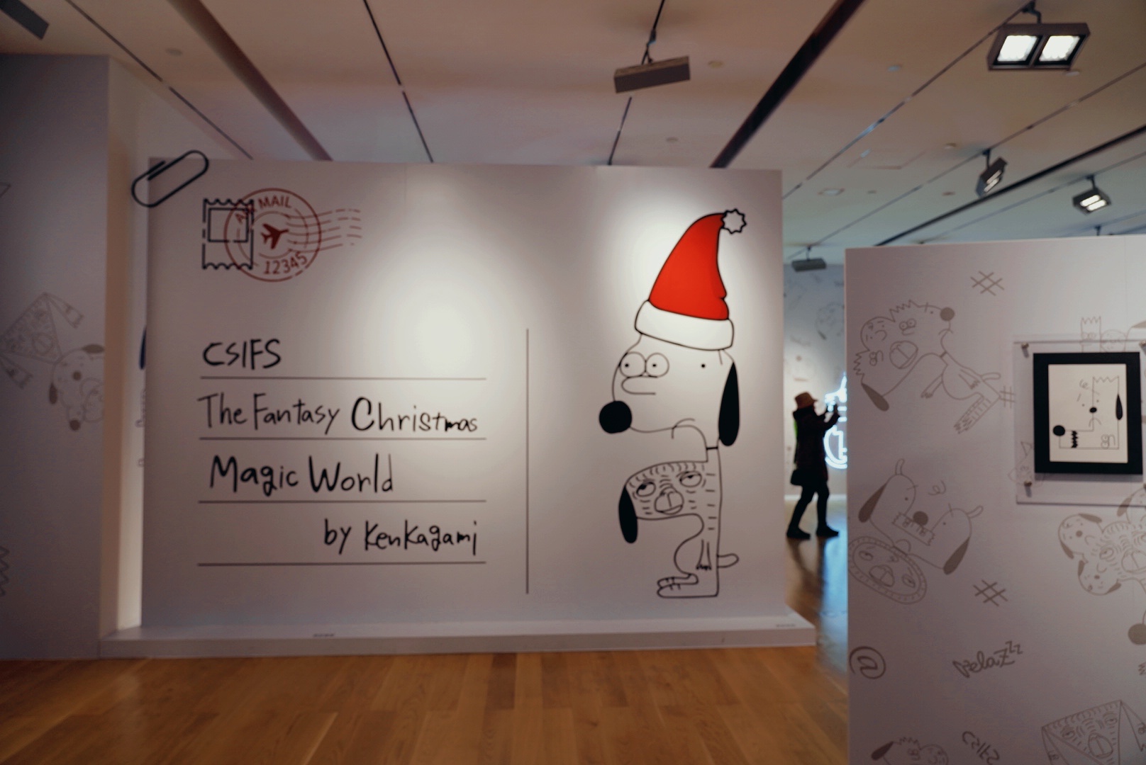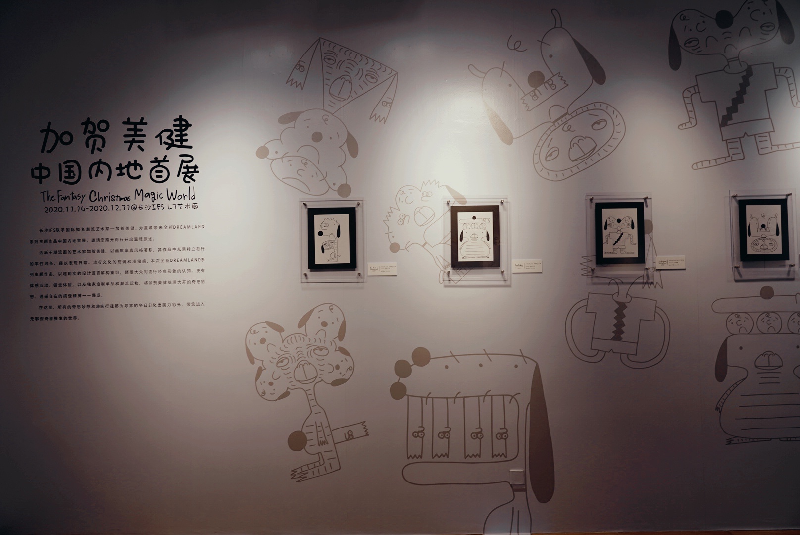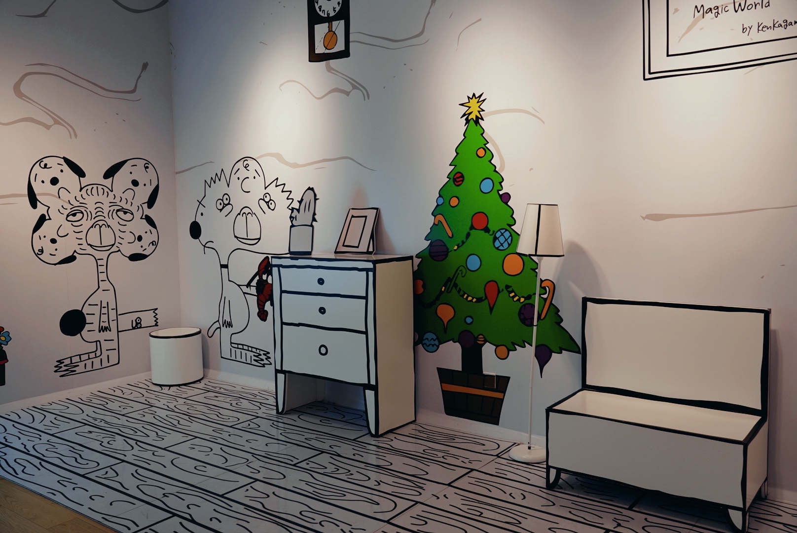 这是加贺美健 中国 内地首展,惟妙惟肖的图案吸引了很多人前来观赏。里面有一整面的投影仪,效果非常不错呢!将趣味行径带入平常生活中,进入一段童话世界里。床和沙发在空中漂浮,房间里的小狗和人物也在熟睡,与LED屏幕互动,简直可以让静止的黑白图案活起来。