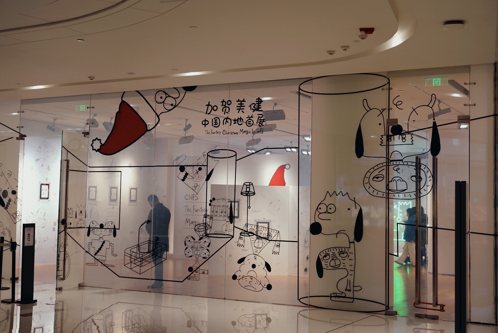 简洁的线条勾勒出了不一样的美感,里面还有一些衣服的售卖区,让人沉浸在非常惬意的艺术空间里。在手稿展示区里,也充满了这个艺术家的奇思妙想,充满想象力的线条,让人会心一笑。还有周边售卖区域的贴纸、铁艺画、咖啡杯、围巾等,都是倾心打造而成。