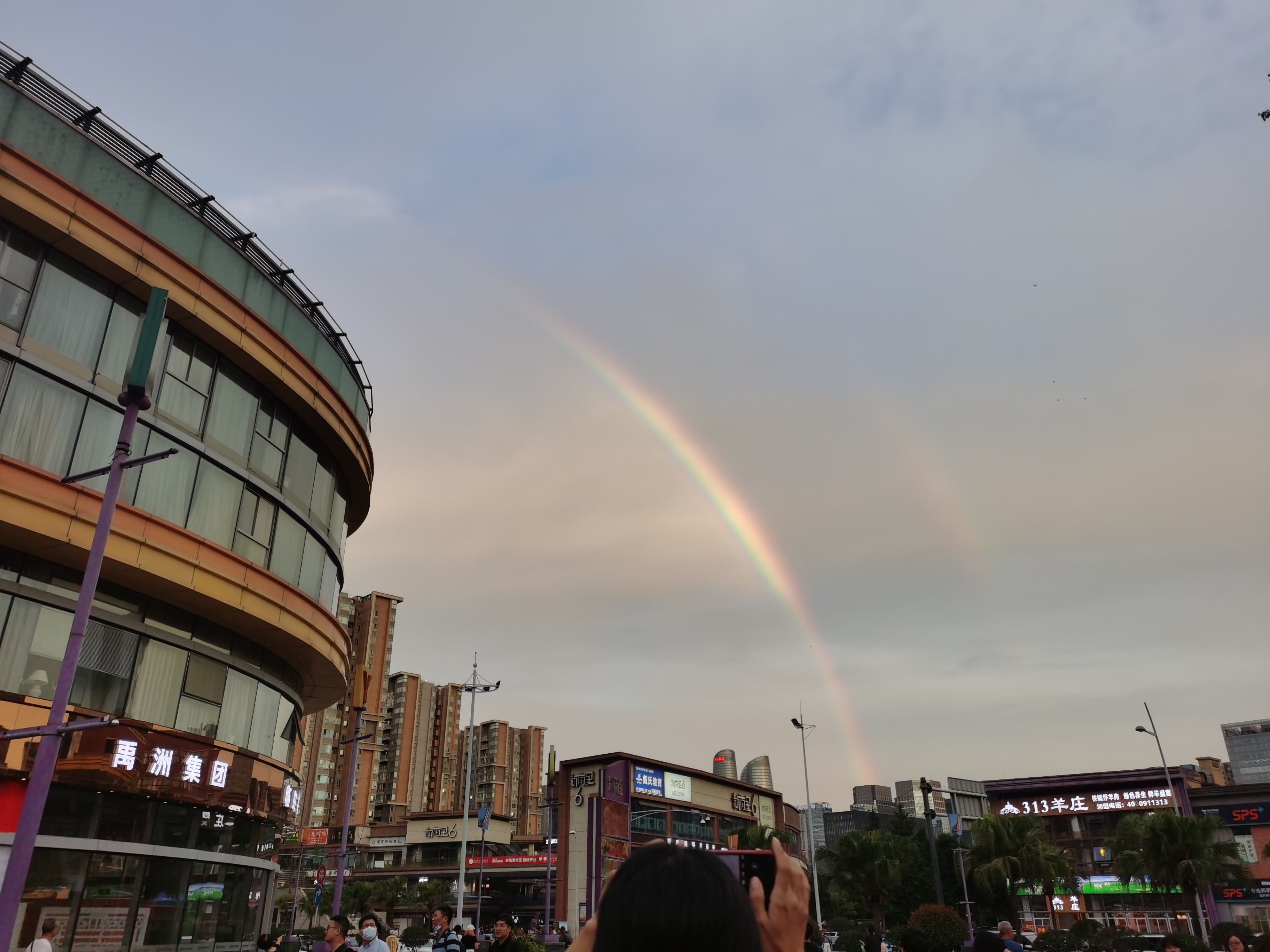 本来在饭店里吃饭,然后看见大家都在往外面去,说是有彩虹,便跟了去,就拍到了这张图,而且还是两圈彩虹,只是没拍下来。