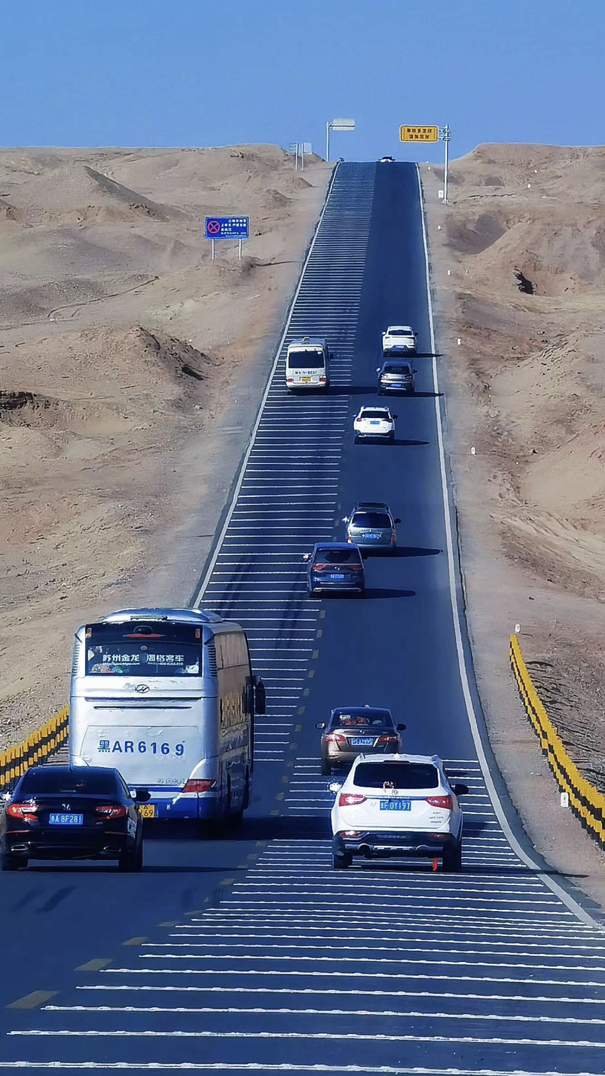 在大柴旦前往茫崖的途中,大约780公里处的波浪公路,看似平整的公路突然从尽头翘了起来。随着车辆向前行驶,公路的那一端随着地平线逐渐升高,慢慢的向天上攀爬,如同一层层波浪般起伏不平。