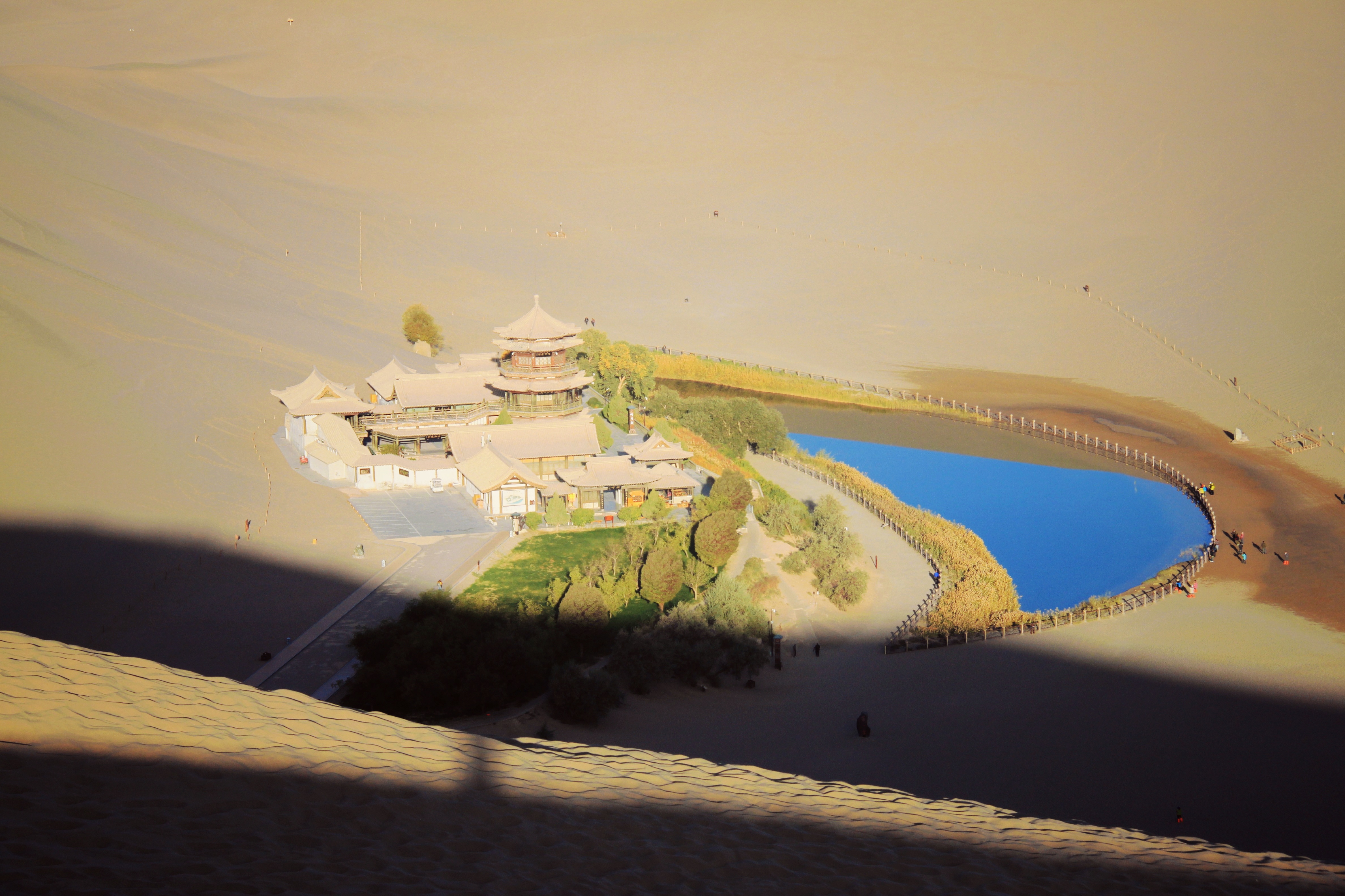 敦煌必去景点,月牙泉在鸣沙山里面,形成于地下水,后因地下水位急剧下降,现在的月牙泉已经很小一片了。我们一早天还没亮就出发爬上鸣沙山,走一步退两步,紧赶慢赶,终于赶上了日出,沙漠日出打卡完成!