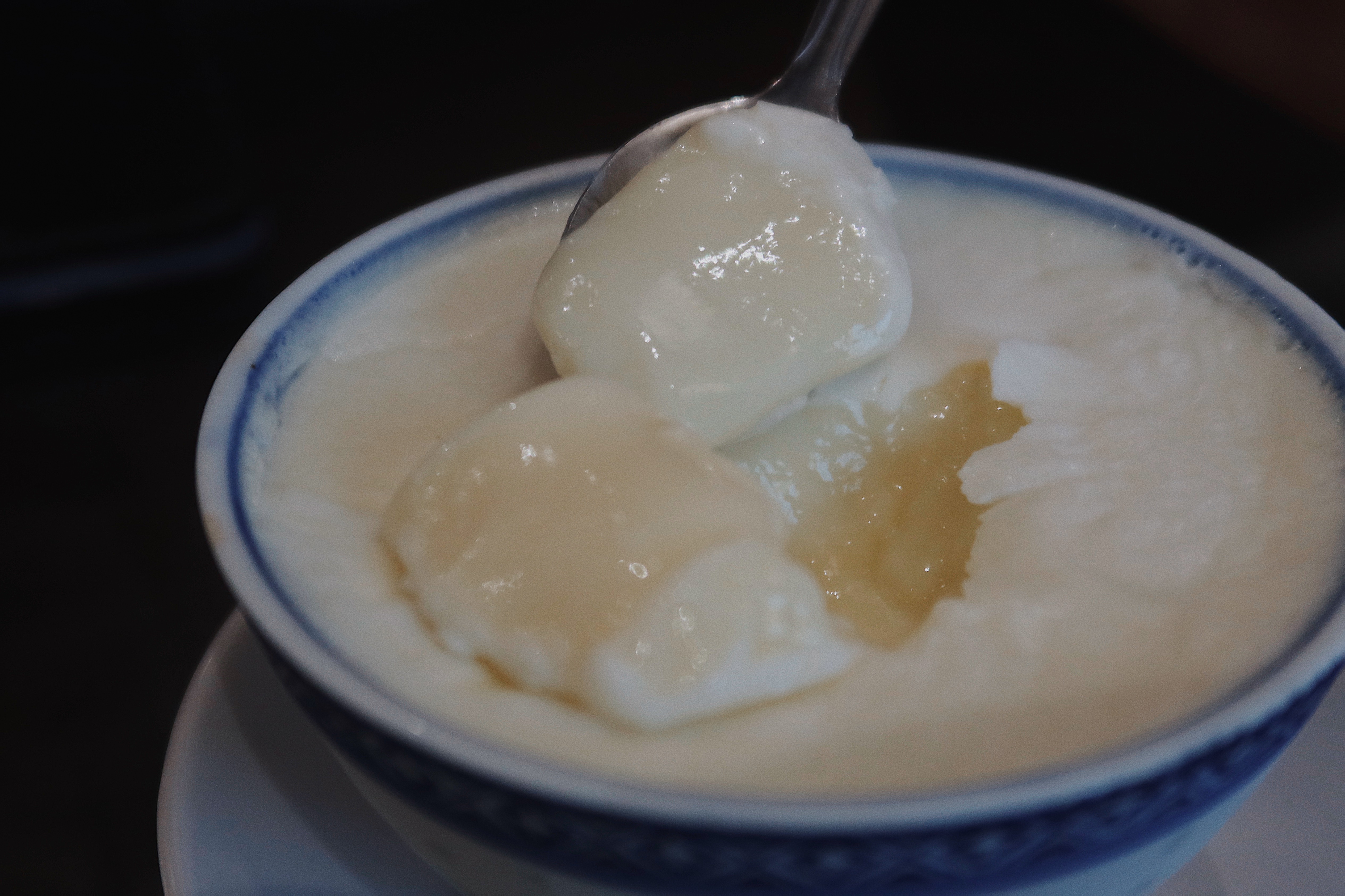 老板娘说,今天有新鲜的牛初乳。这家店的牛初乳是用牛初乳和鲜牛奶以一定比例混合后炖煮而成,成品是类似于双皮奶的冻状,但质地略有不同,表面也没有双皮奶一样的褶皱,香浓的口感值得打个高分。姜撞奶可以选择辣度,凝固的一般,但奶香与姜汁的味道比例拿捏得刚刚好。