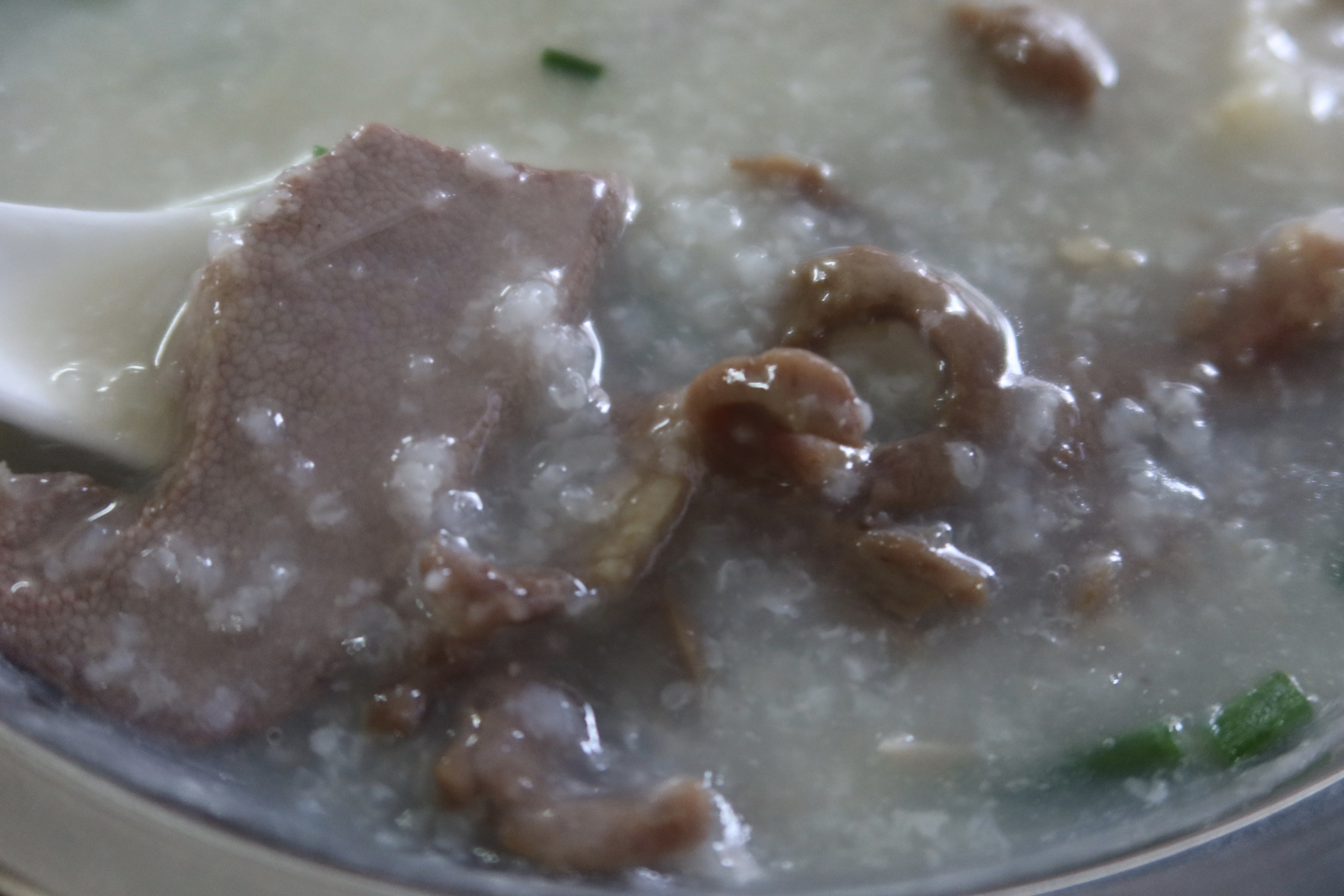 冒着热气的粥盛放到面前,猪肝是切成厚片,口感极嫩也没有肝脏常有的苦涩味,猪舌片在高温的作用下卷曲起来,爽脆弹牙。一碗热粥下肚,清晨的凉意被驱散的干干净净。