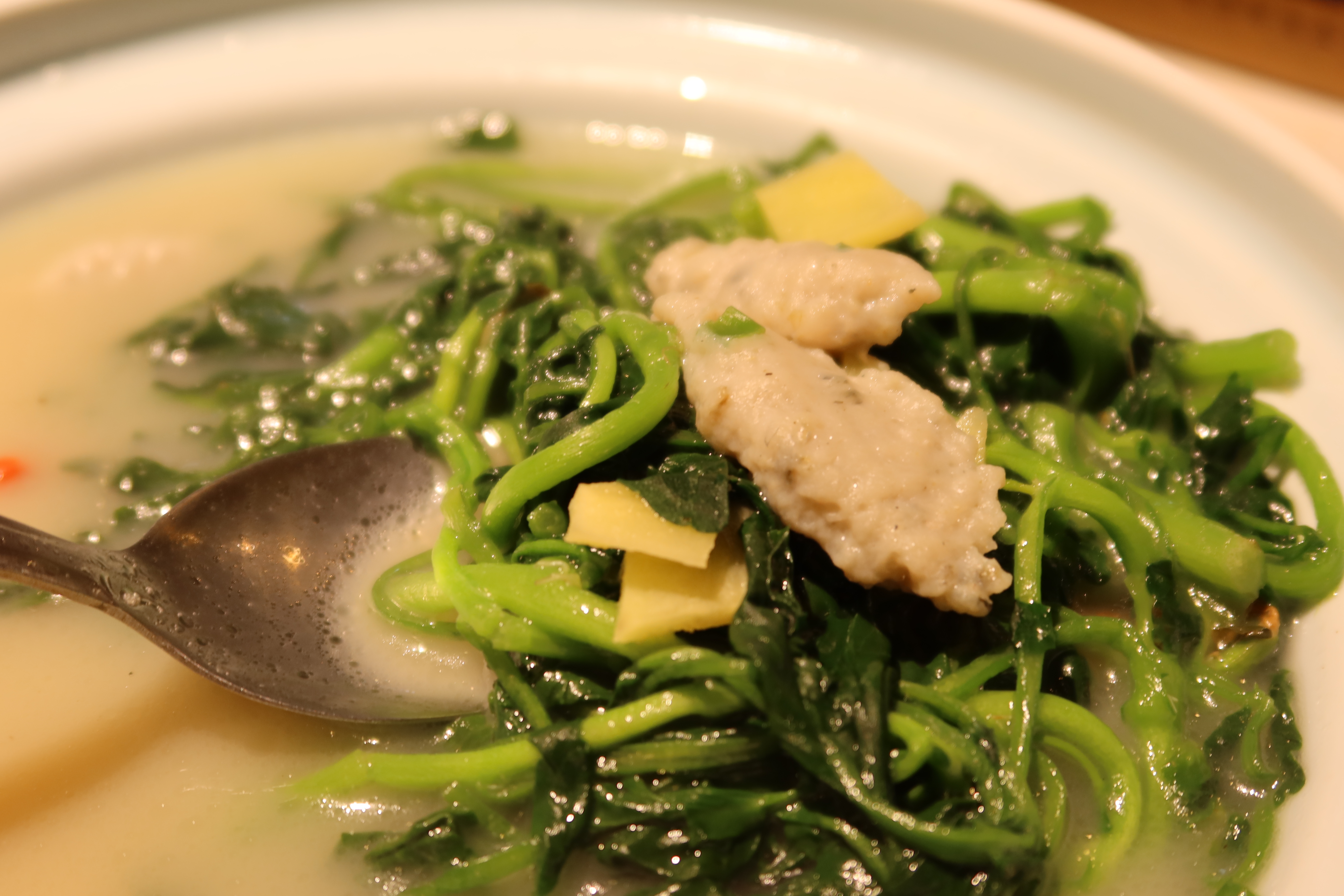 枸杞叶用加了蛋花做汤,细细的姜丝让菜叶的鲜甜更佳惹人喜爱了。