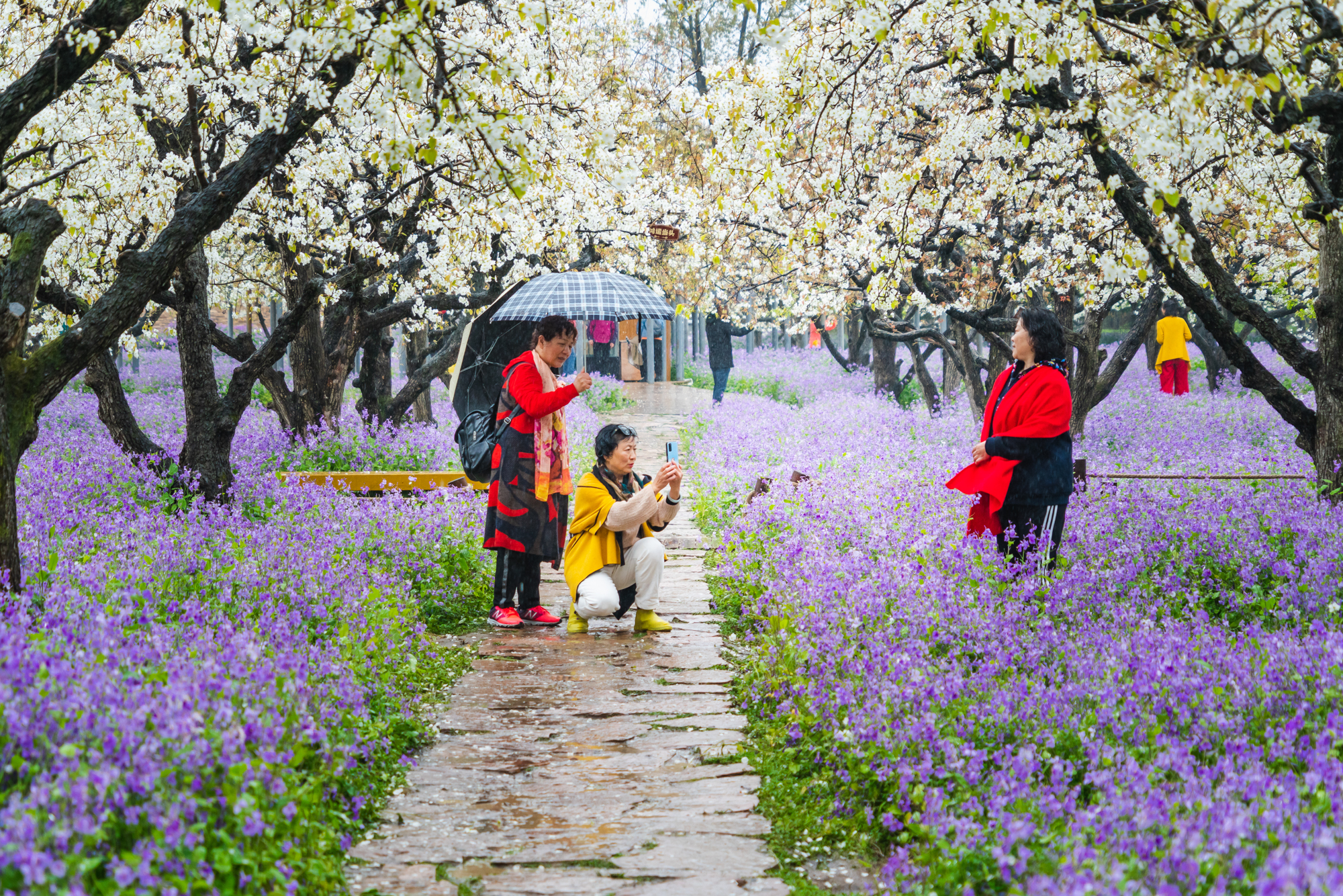 500亩梨花、二月兰竞相开放,梨花洁白象征着纯洁,梨林的间隙种植的是二月兰,二月兰蓝中带紫,是浪漫的气息。阡陌交错间,白色的梨花与雅致的兰花交相辉映。那梨花开得热闹而欢畅,晴空万里时,是千树万树梨花开;春雨如酥时,梨花一枝春带雨,再加上那如海浪般随风摇曳的兰,有暗香袭来。