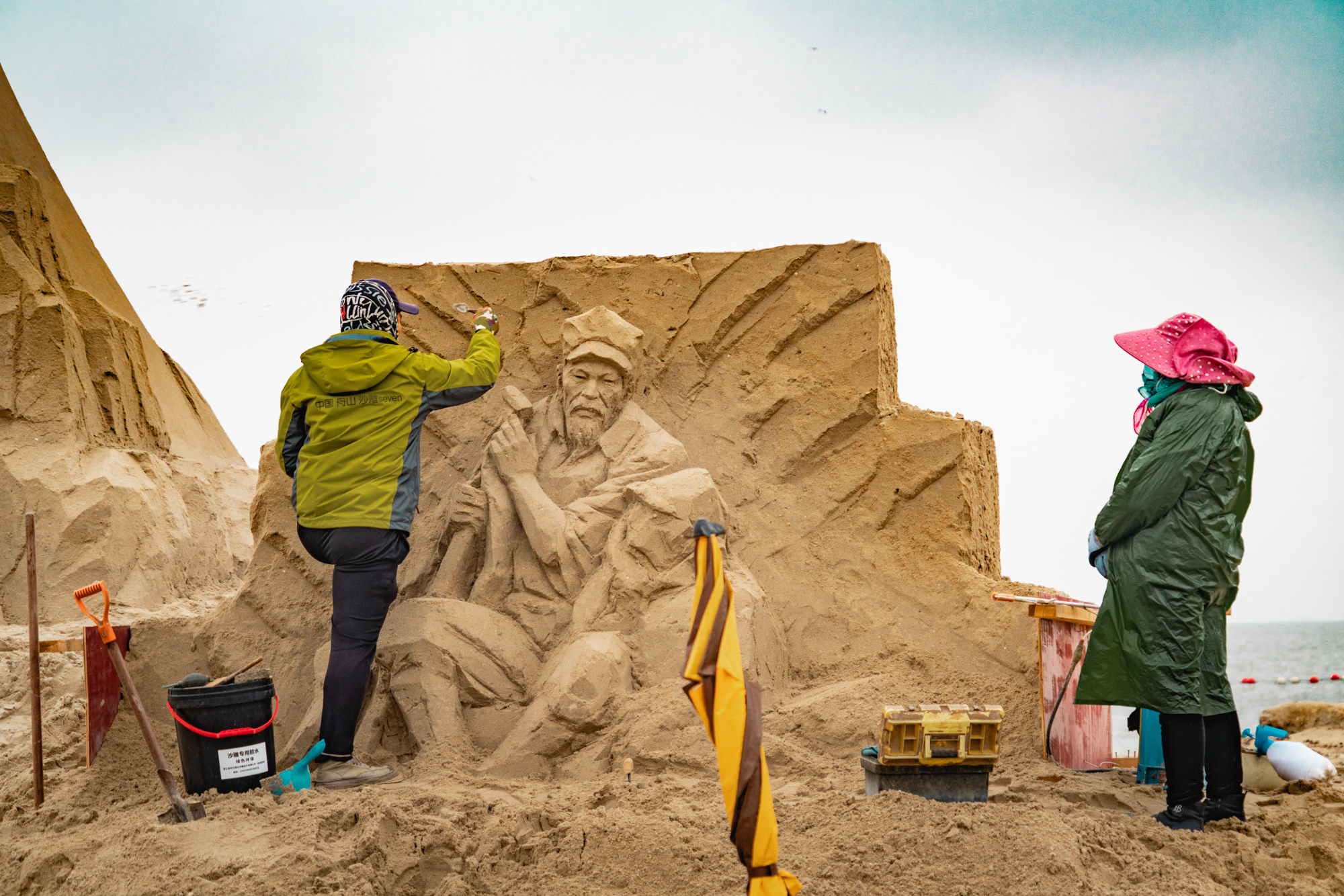 在沙滩的东北角,有沙雕工人在整张的忙碌着,他们是在为2021年第三届中国宿迁骆马湖国际沙雕节做前期准备工作。据悉,本届沙雕节以“百年征程,流光溢彩”为主题,旨在弘扬民族精神和爱国情怀。