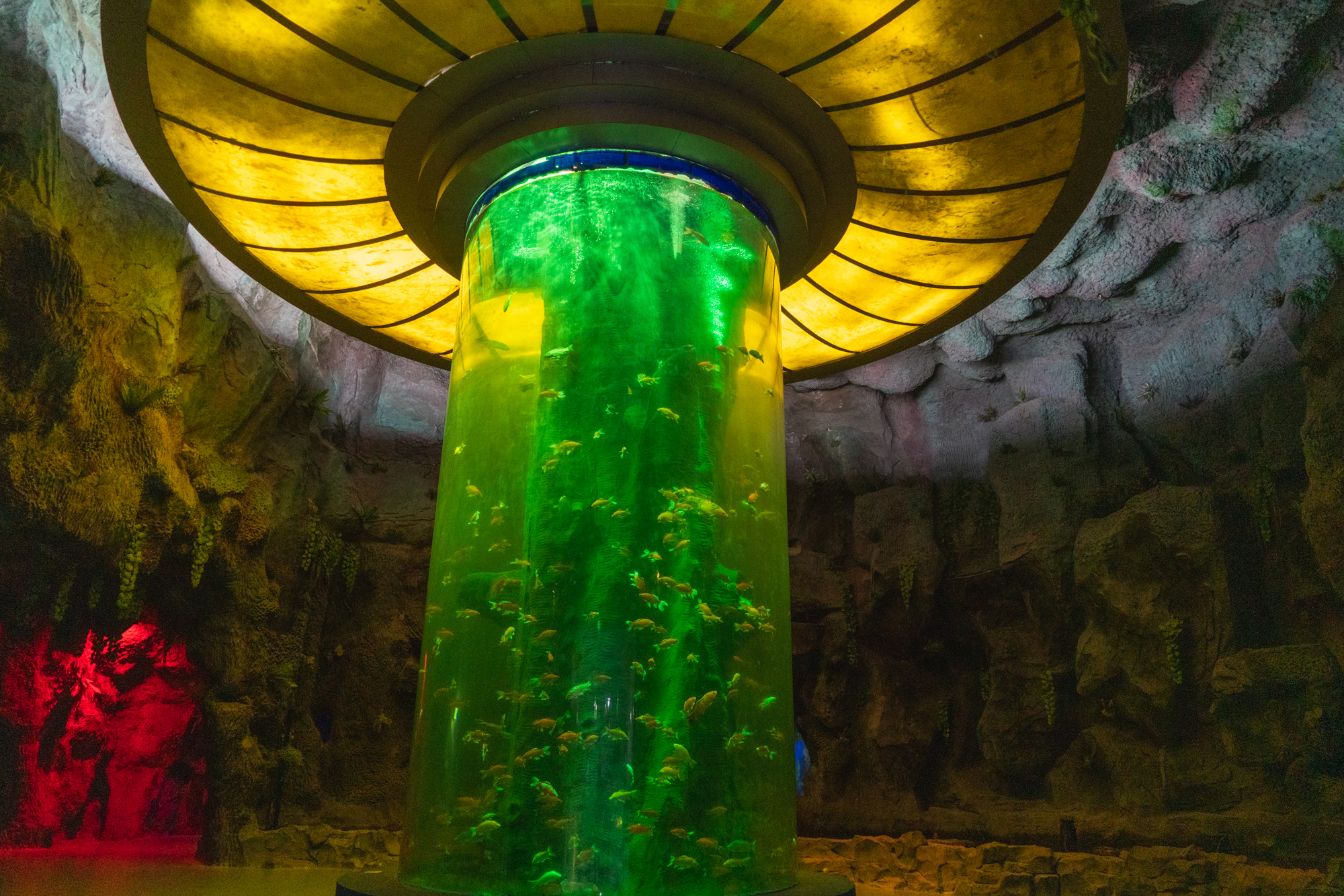 场馆对面的水岸,是拍照的好地方,透过前景金花色的油菜色,水里的倒景与地上实景构成了一幅稳定对称的画面。洪泽湖鱼族馆是苏北首家淡水鱼类展示馆,形似一条鲤鱼游弋在美丽的湿地景区内,馆内集中展示洪泽湖70余种淡水鱼和部分色彩艳丽的热带鱼,是一座集休闲、观光、科普为一体的现代化淡水鱼类展示馆。