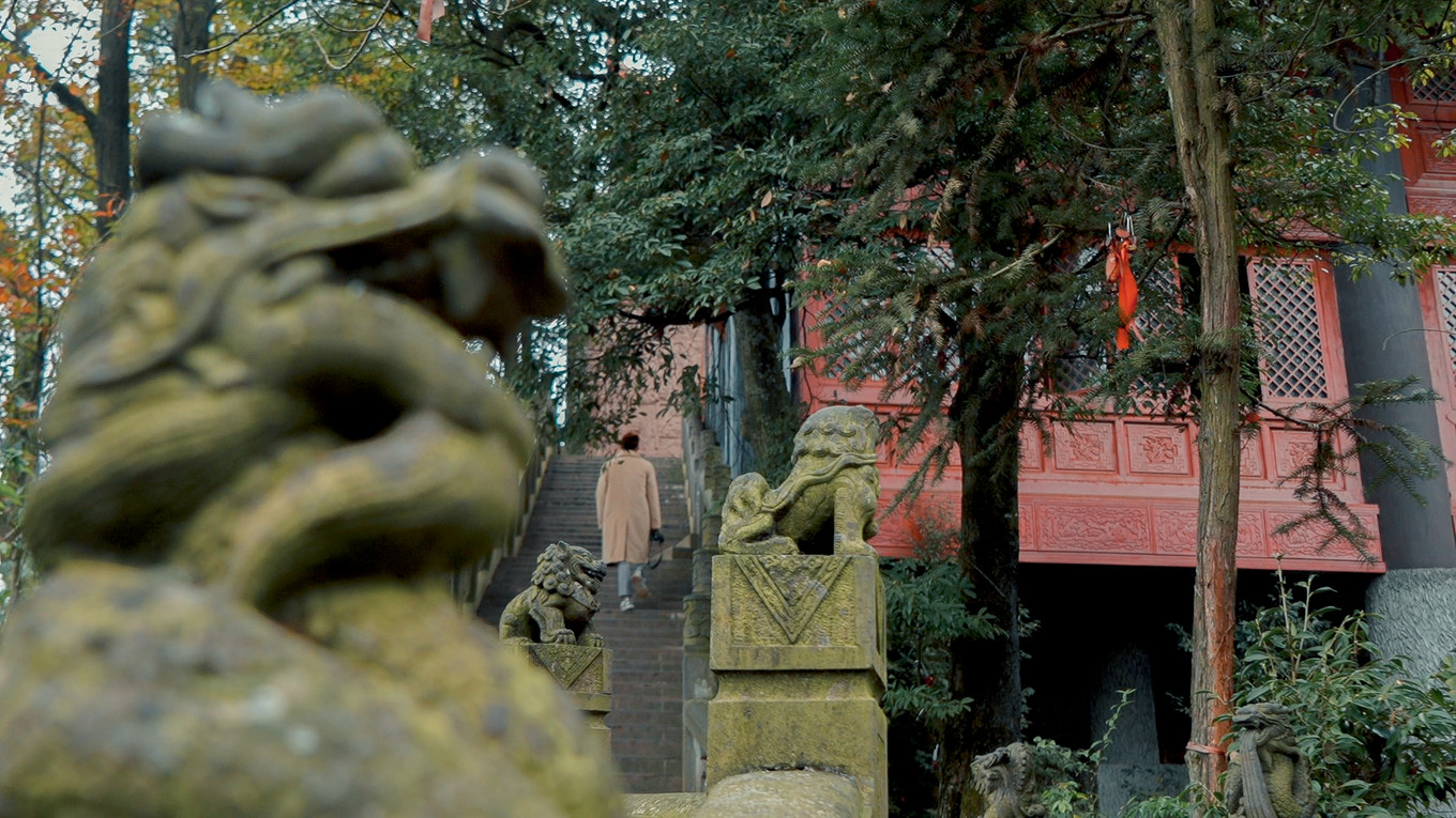 择一处山石闲坐,山风吹过,落叶带着青城山中难得的秋意而下。