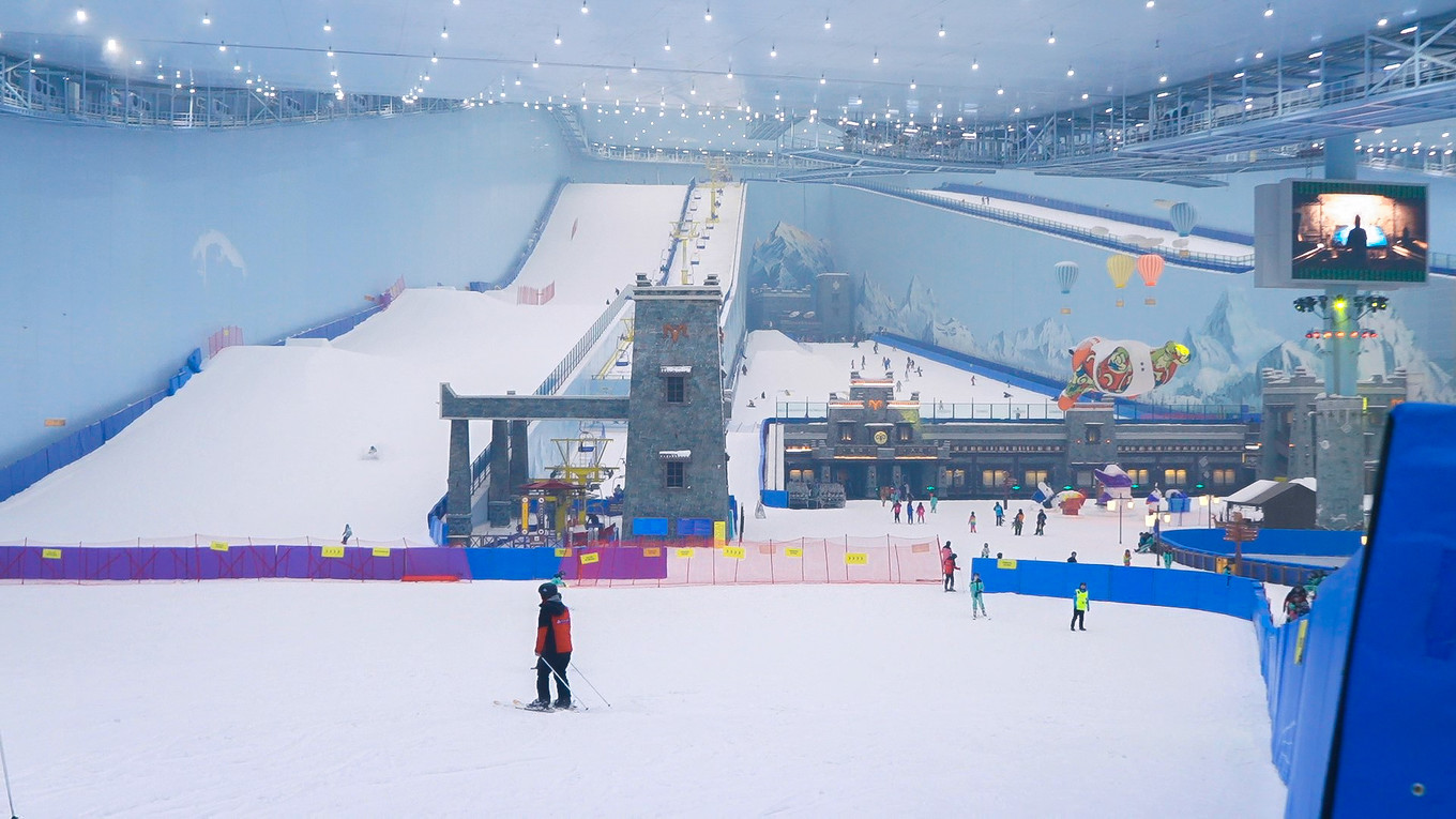 融创雪世界总建筑面积约8.08万㎡,拥有6条不同等级的滑雪道和2个地形公园,全天可接待5000人滑雪,全球最大的室内滑雪场,从初学者到发烧友全面满足。