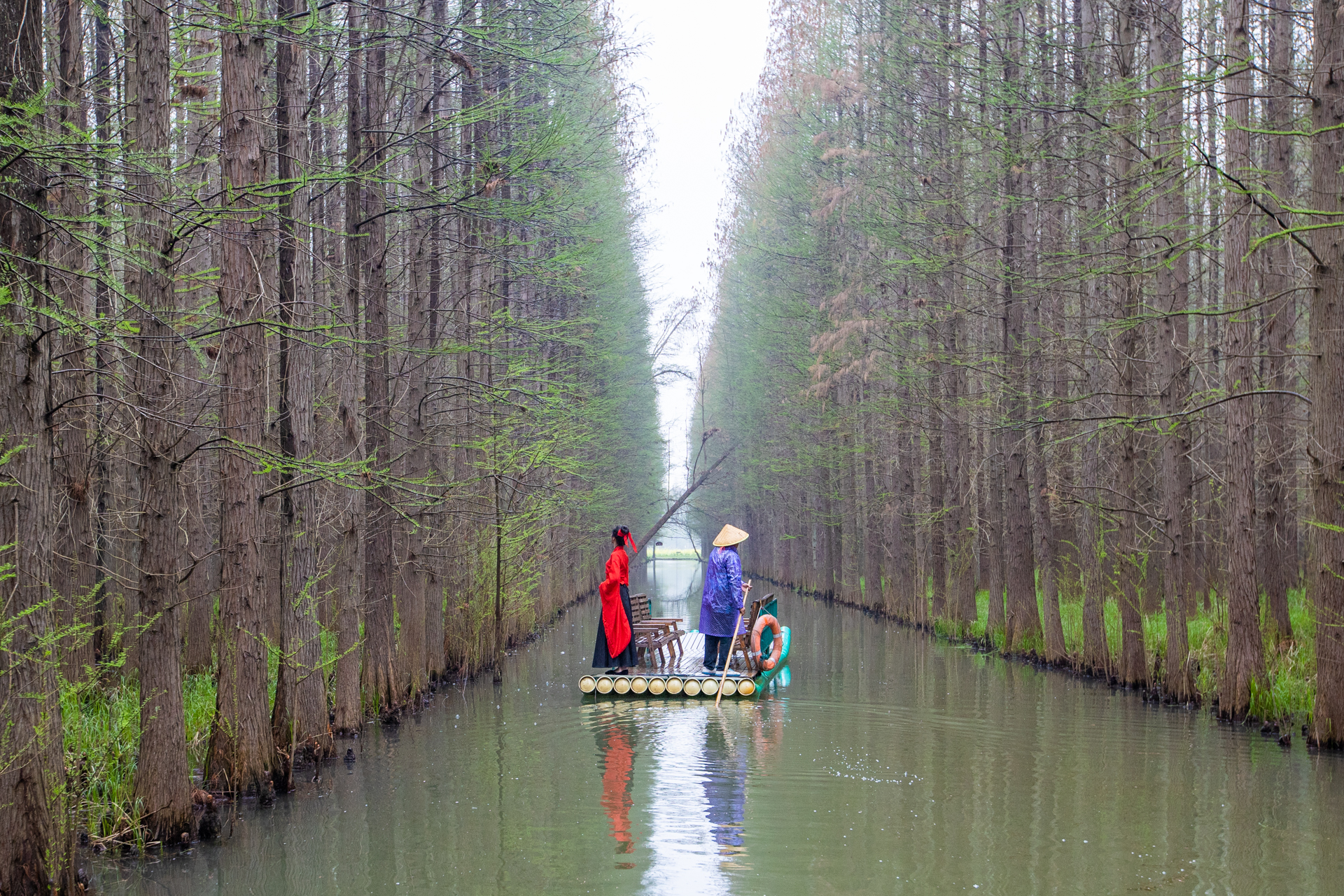 乘坐景区内的木筏漂游其中,观池杉参天,看树梢益鸟欢聚,杉林水韵令人沉醉其中。途中,还有一颗造型奇特的网红迎客杉,深受游客喜爱。鳞次栉比的池杉,它们的根叫做气根,与普通植物的根不同。形状各异的气根,也是一道亮丽的风景线。水上游览美景的体验,太独特了,真是舟在水上走,人在画中游。