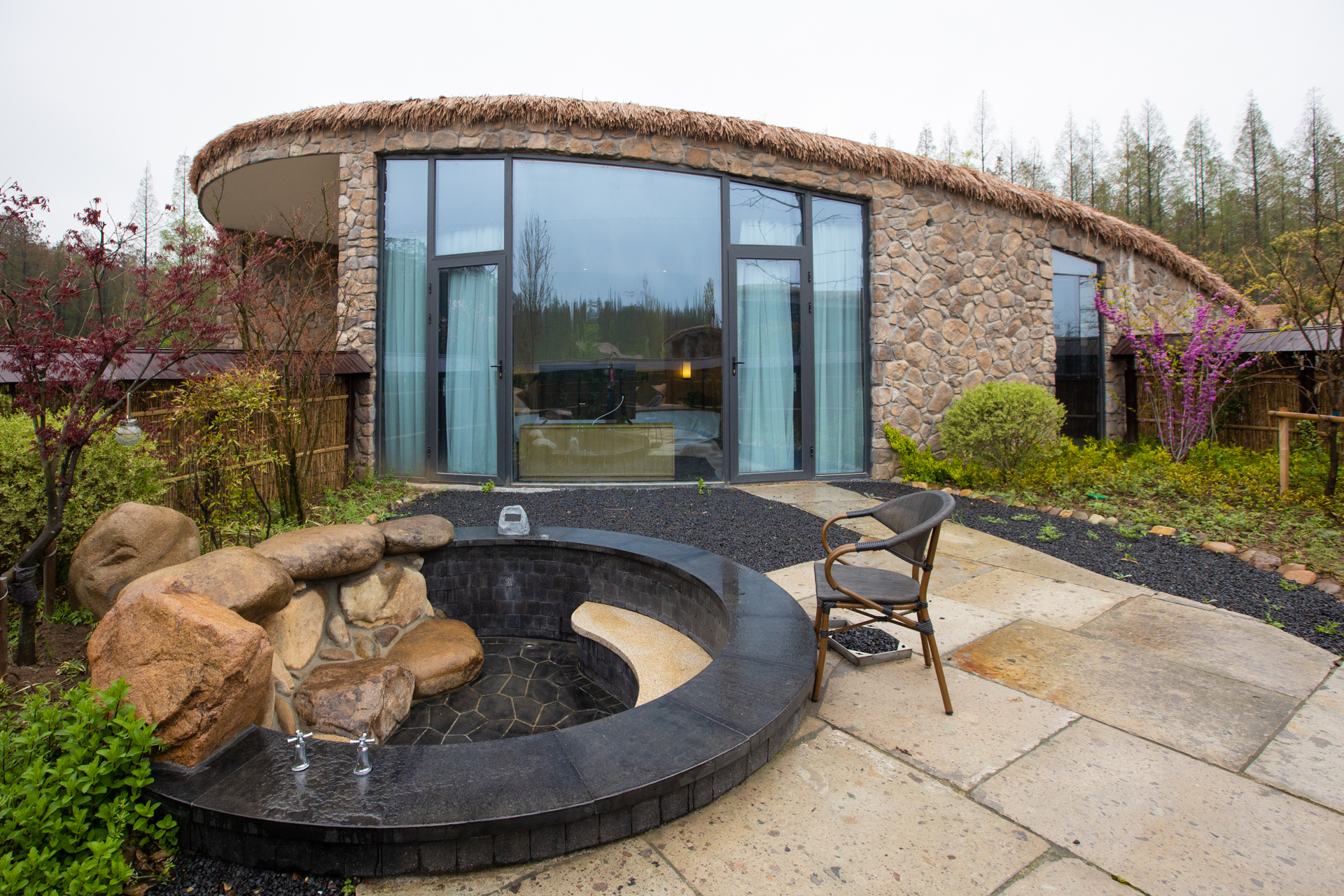 酒店就位于金湖水上森林景区内,三面环杉。客房造型非常特别,采用茅草斜屋顶。一房一院一泡池,每个客房的院子里都有温泉泡池。游玩一天后,回客房泡一次舒适温泉,真是太享受了。出门即是水上森林,进屋可泡温泉私汤,这样的酒店仿佛是童话世界。