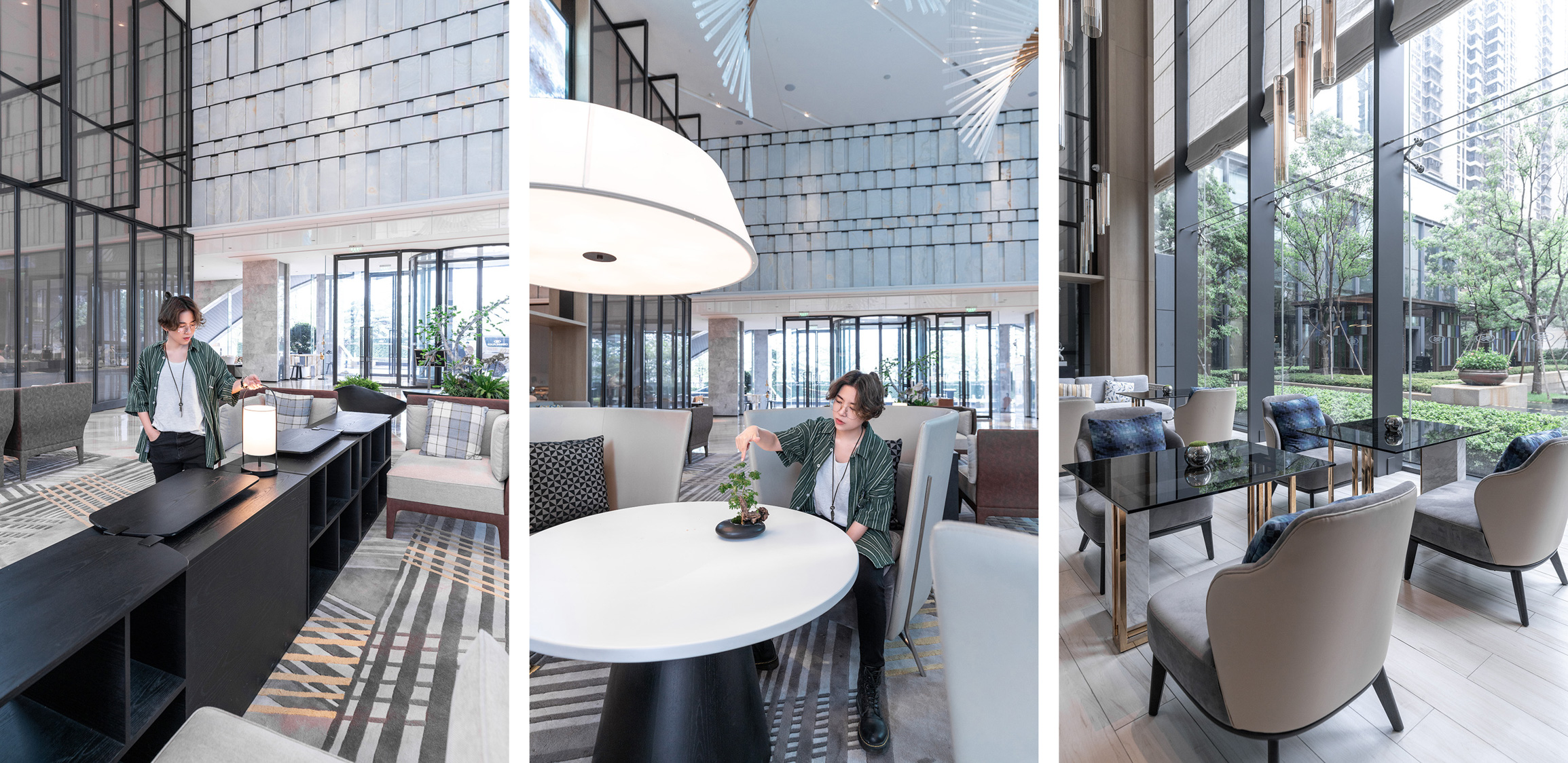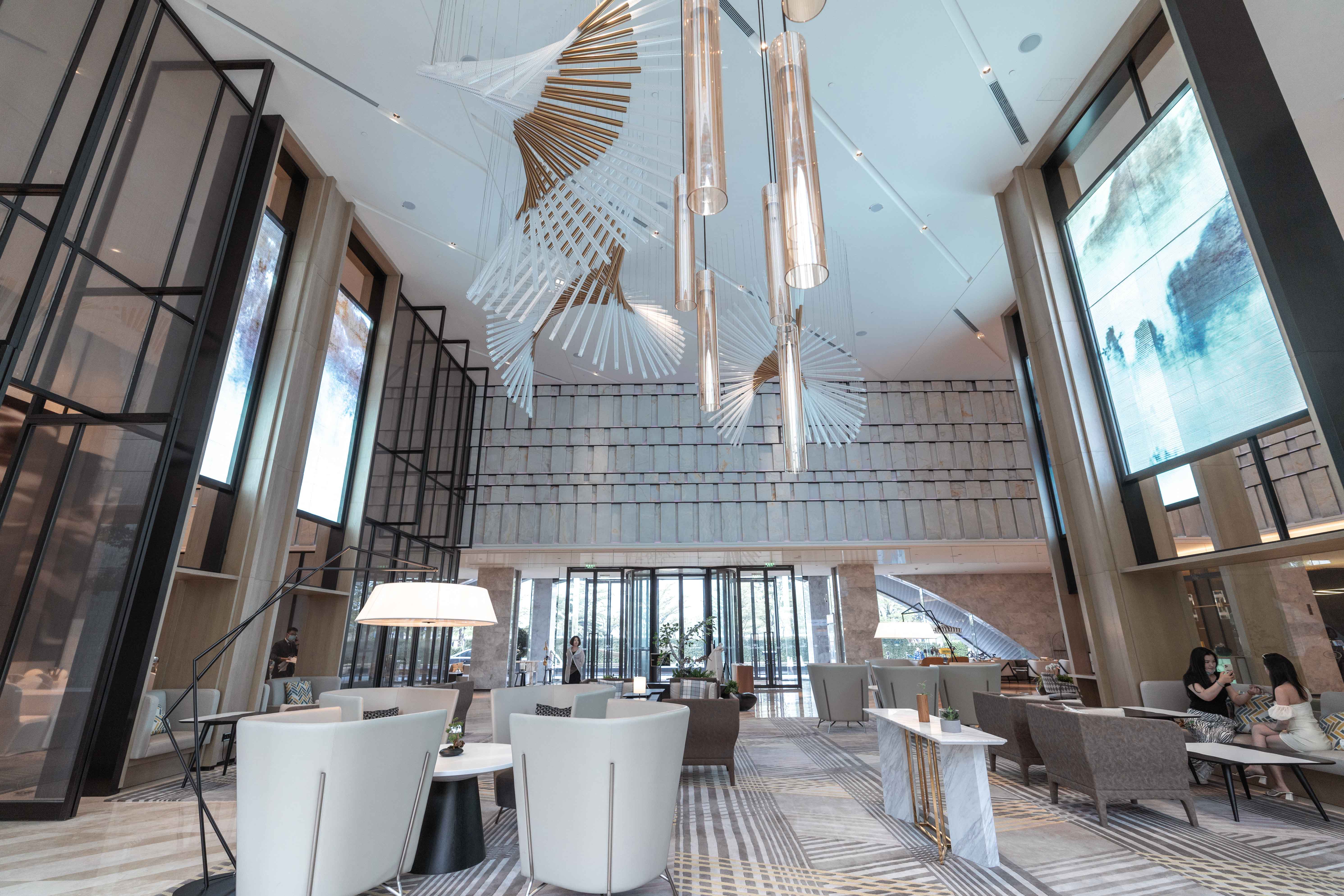 现代而时尚,第一眼就被大堂的设计所惊艳,各种线条的美感和颜色的搭配都显得十分高级,整个酒店就像是一件精雕细琢的艺术品。而最让我记忆深刻的是大堂内的超大冰屏,上面播放着佛山记忆的山水水墨画,让酒店更添了一些韵味。
