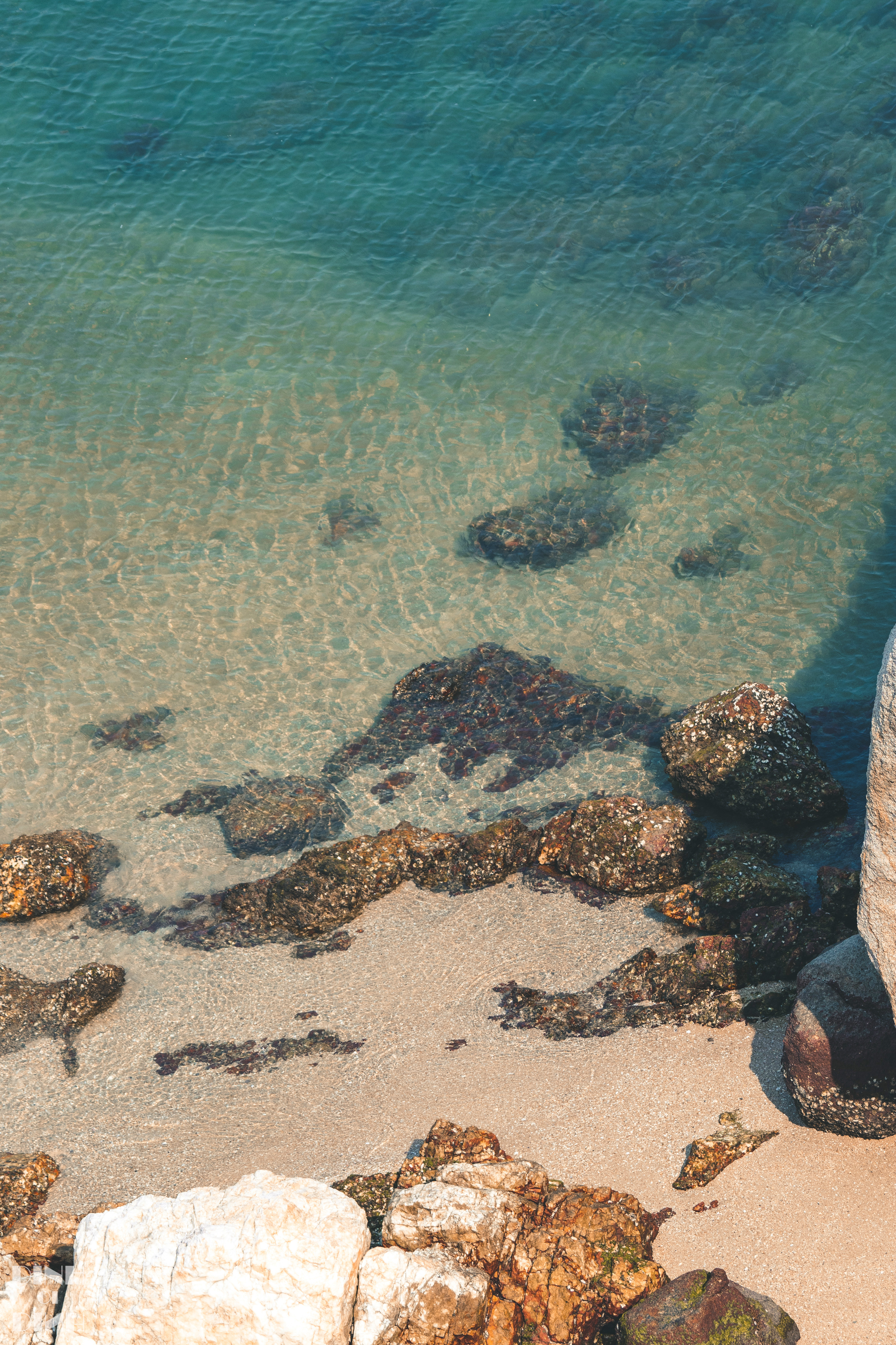 岸边没有沙滩,而是被海浪侵袭了不知道多少年的礁石,空中俯瞰,层次分明,海水碧蓝碧蓝的十分清澈,海浪拍打着岸边激起一片白色的泡沫。