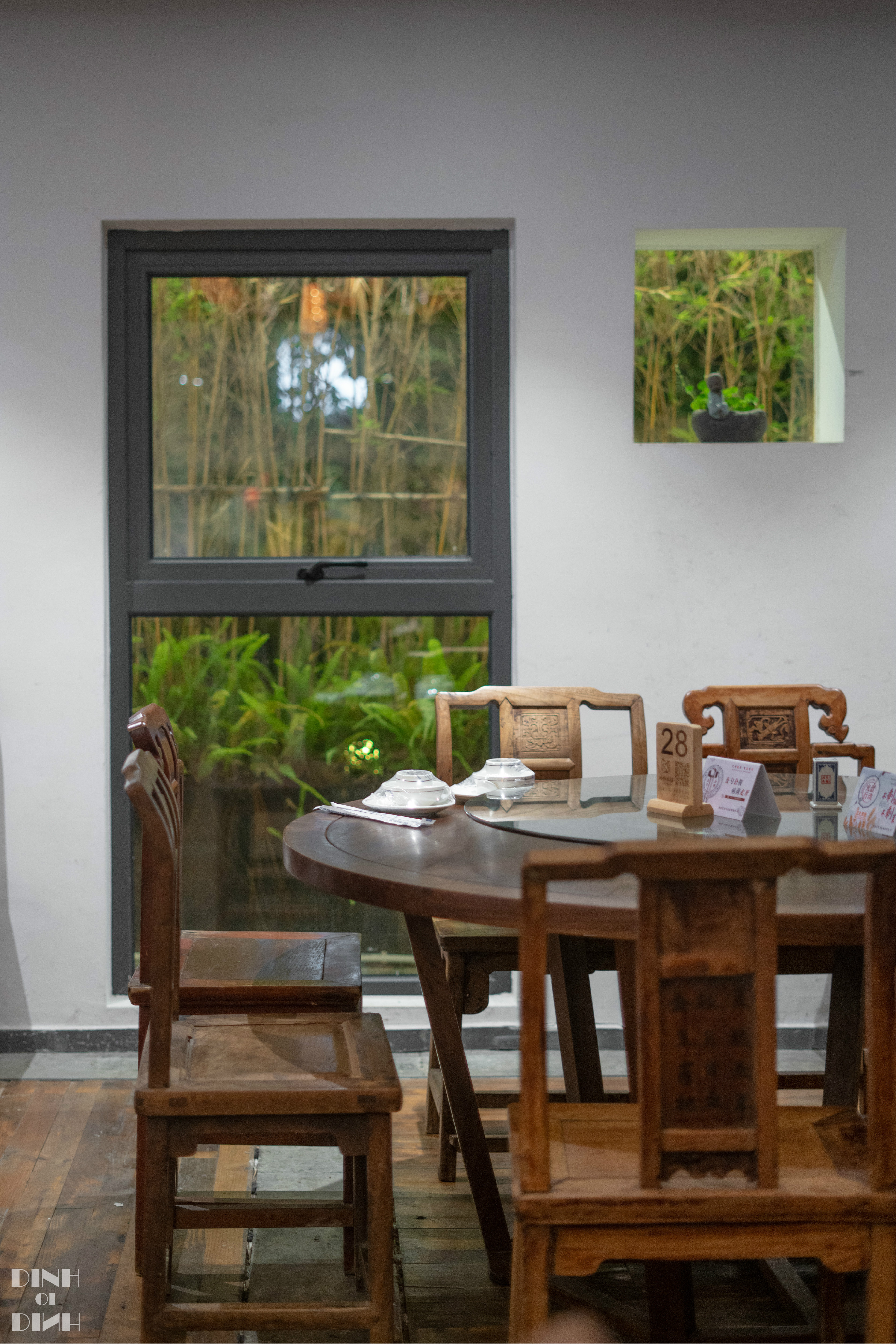 秋长谷里配套了中餐和西餐厅,都在半月形池塘边,天气好的时候,两边露台上饭菜飘香,笑语盈盈。中餐厅主打客家菜,其内鱼篓造型的灯饰饱含水乡韵味,木椅古色古香,椅背上还有精雕细刻的仕女图案。