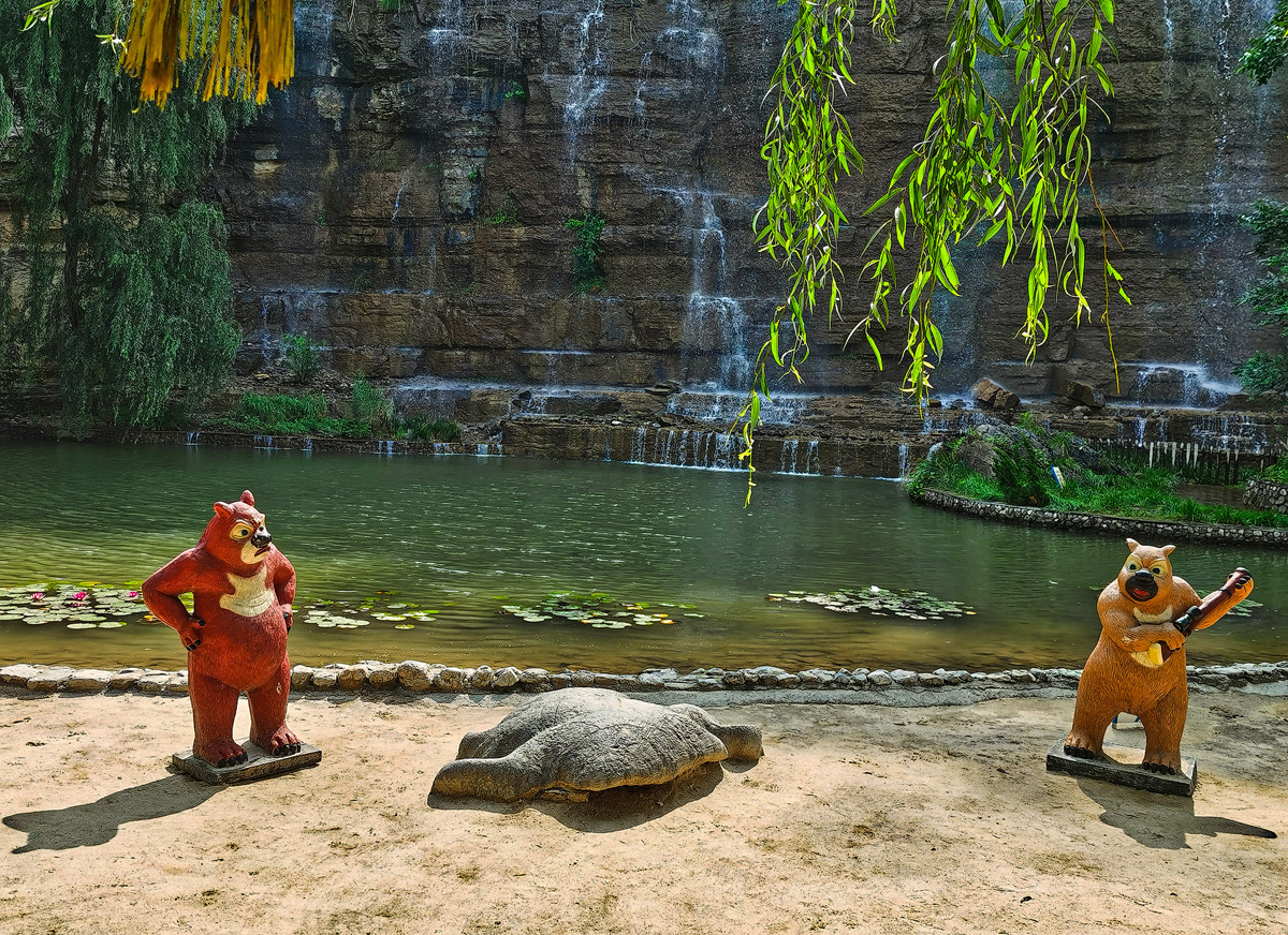 潭溪山旅游区已获得国家4A级旅游区,国家森林公园,省级地质公园,国家水利风景区, 山东 省重点风景名胜区等称号。看见瀑布边的大熊,二熊,姿势可爱! 我们和俩个熊熊合个影吧……