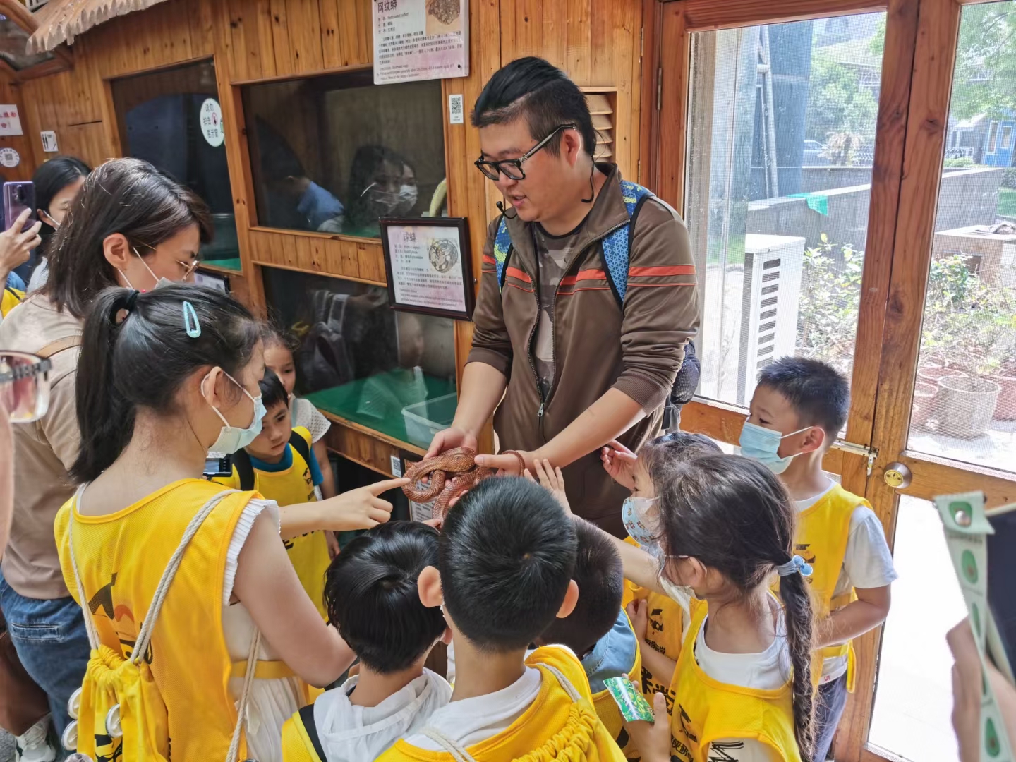 温柔的小蛇盘于老师手中,羞涩地环顾周围。