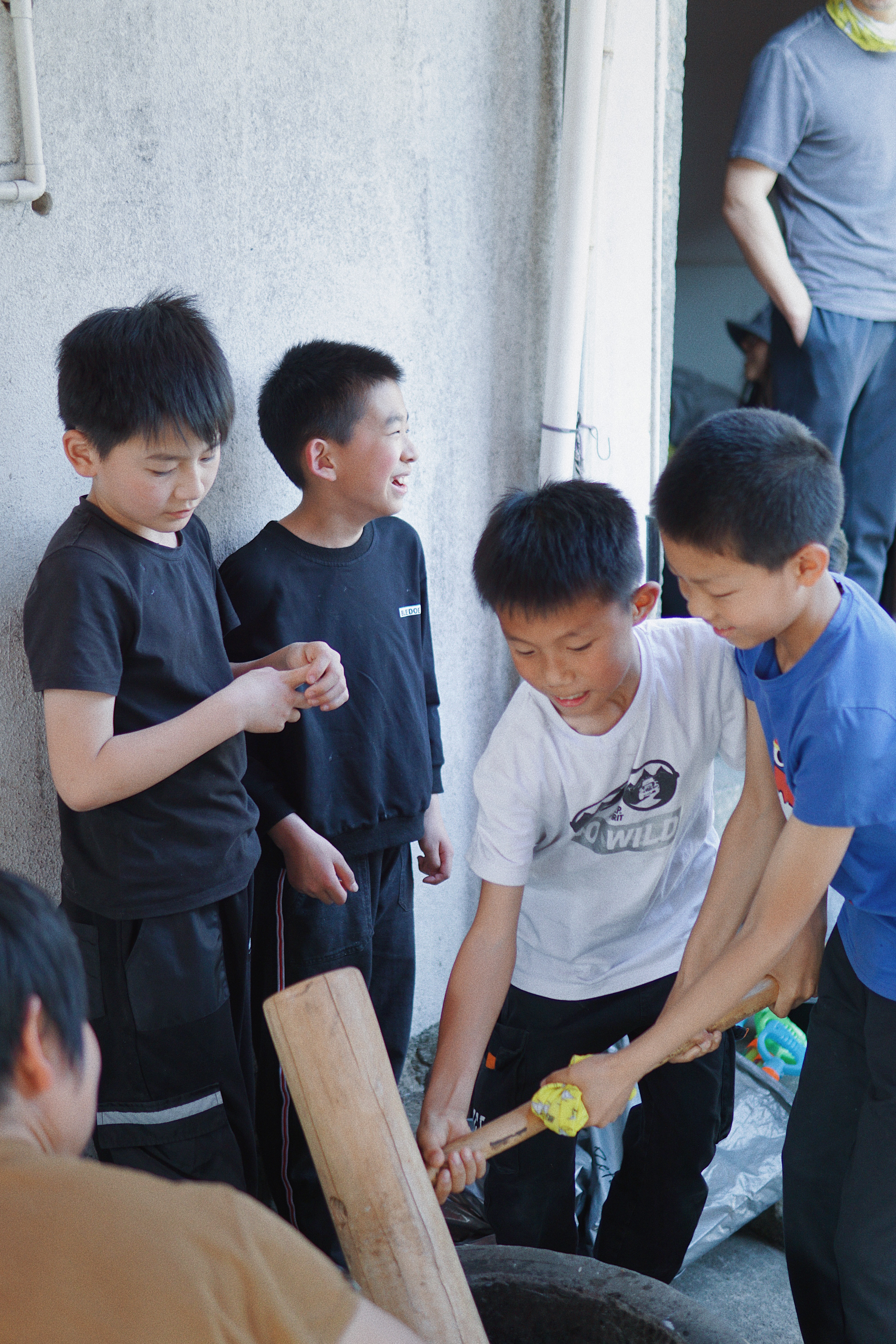 大约二十分钟后,第一锅热气腾腾的糯米饭出锅了,经验丰富的外公将其倒入专门用来打麻糍的石捣臼中,用舂头不停地舂捣糯米饭。告诉我们糯米饭舂捣的越糊越好,此时我们的家长跟小朋友们纷纷加入,帮忙轮流舂捣着,大家纷纷使出了九牛二虎之力。