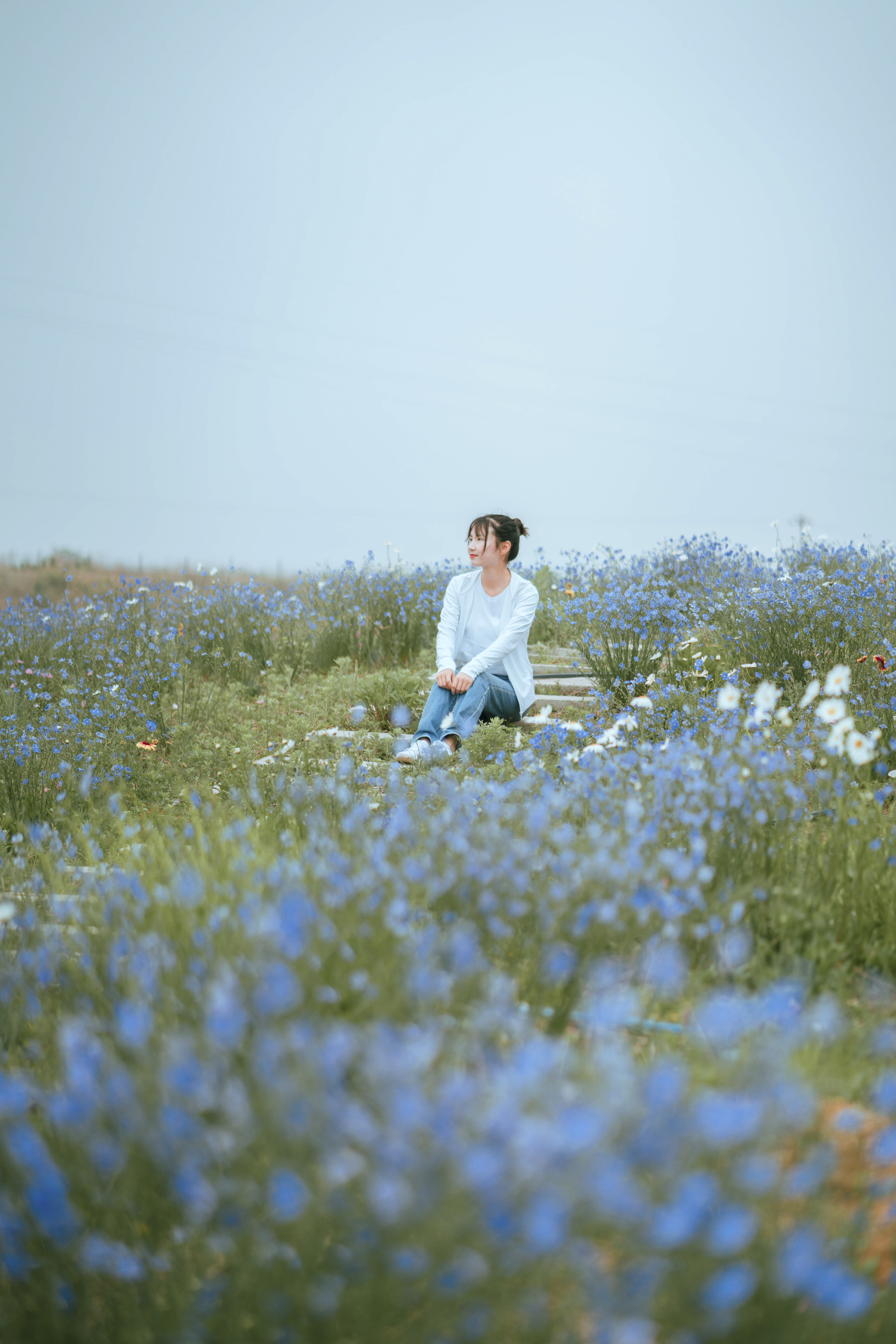 2、目前盛开的主要亚麻花和大滨菊,色彩比较清雅,小姐姐的着装也适合淡雅风格,拍摄出来很日系;