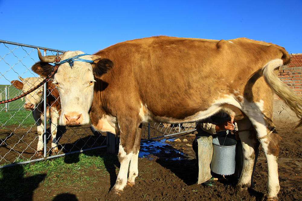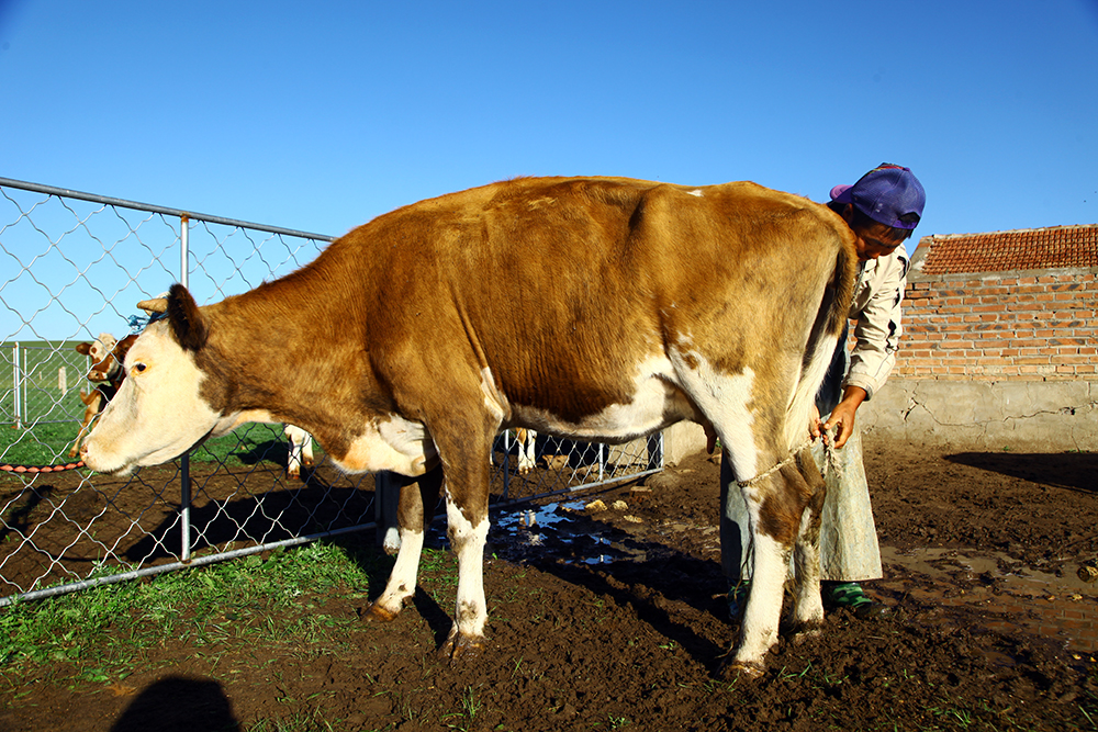 牧民为了等我们,把他的羊群交给邻居一起放,回来用自家的井水喂牛。“要不是你们来,”牧民的汉语说得挺好,“我们五点多就得把牛都放出去了!不然这一天都吃不饱。”原来也很辛苦的。接下来我们跟着他来到牛栏,泌乳的牧牛和吃奶的半大小牛犊是分开栏住的,这会打开门牛犊赶紧跑向妈妈开始吸吮乳汁,嘴角浓白地滴出奶来。才吃了几口,被牧人制止并拉开,原来这样是为了让牧牛顺利下奶。小牛被少年牧民拉去旁边,老牧人穿上皮围裙,提上奶桶,先把牛的后腿绑上,就坐在旁边开始挤奶。乳汁成一条白色的细线,一头牛能挤上一小桶。牧民说:“这是个辛苦活儿”,他们需要五点多放牛出去前完成挤奶,通常是家里的女人做这个,挤一头牛大概用了十五分钟,手指是非常酸痛的,起得也实在早。今天牧民只是让我们感受一下,只挤了一头牛,其它的都任由小牛犊吃得饱饱的。他们是挑选那种能够自己吃草了的半大小牛的妈妈去挤奶的,这个断奶期在半大牛身上也不好受,它一个劲往母牛那靠,还不停哞哞地抗议。最后挤完奶,少年牧民才放出半大小牛,把母牛的乳汁吸干净,这样利于它继续泌乳,也能保证乳腺的健康。其实牧民都是好兽医,了解牲畜的方方面面。