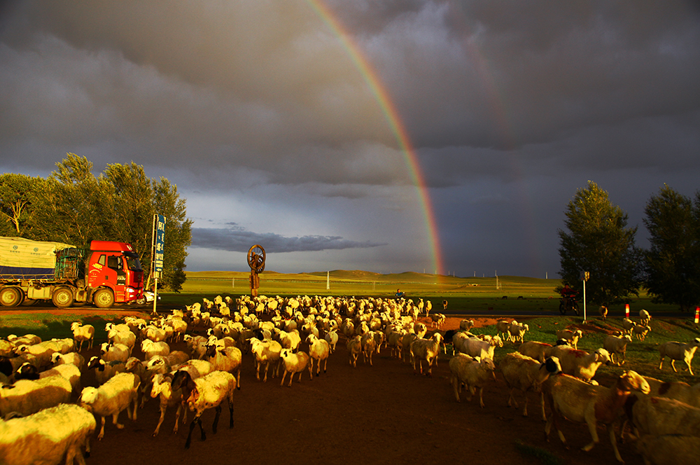 本来有些懊恼中,下午的15:46,快要开回住处的路上,同事突然指着车外大喊“彩虹彩虹!”右前方一道平虹拔地闪耀在地平线上,美轮美奂!更精彩的是疾驰回到原上彩虹,正赶上雨还没停,阳光斜射,牧羊人正急急忙忙地冒雨赶回羊群,两道彩虹跨在天边!哦~草原,美得有点夺魂摄魄了!