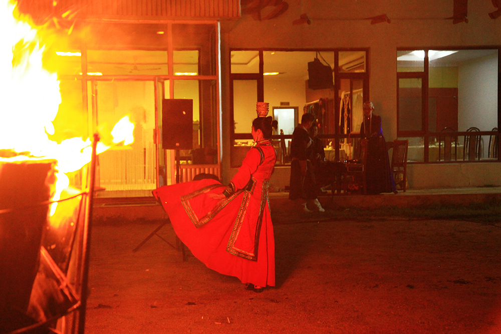 到达草原的当晚必须是烤全羊。蒙古烤羊是现宰、整煮、整烤、整上,半大的羊肉有焦有嫩最好吃。全羊上来还有那种特别俊朗的蒙古妹子来唱歌,虽然听不懂但那纯天然嗓子几乎把我震聋了,当然酒也都没少喝。马头琴也很好听,蒙古酷哥还唱了一种叫呼麦的神奇音乐,不像人声。哈哈,据说是一种很难练成的喉音。之后当然得篝火晚会,high到不行。
