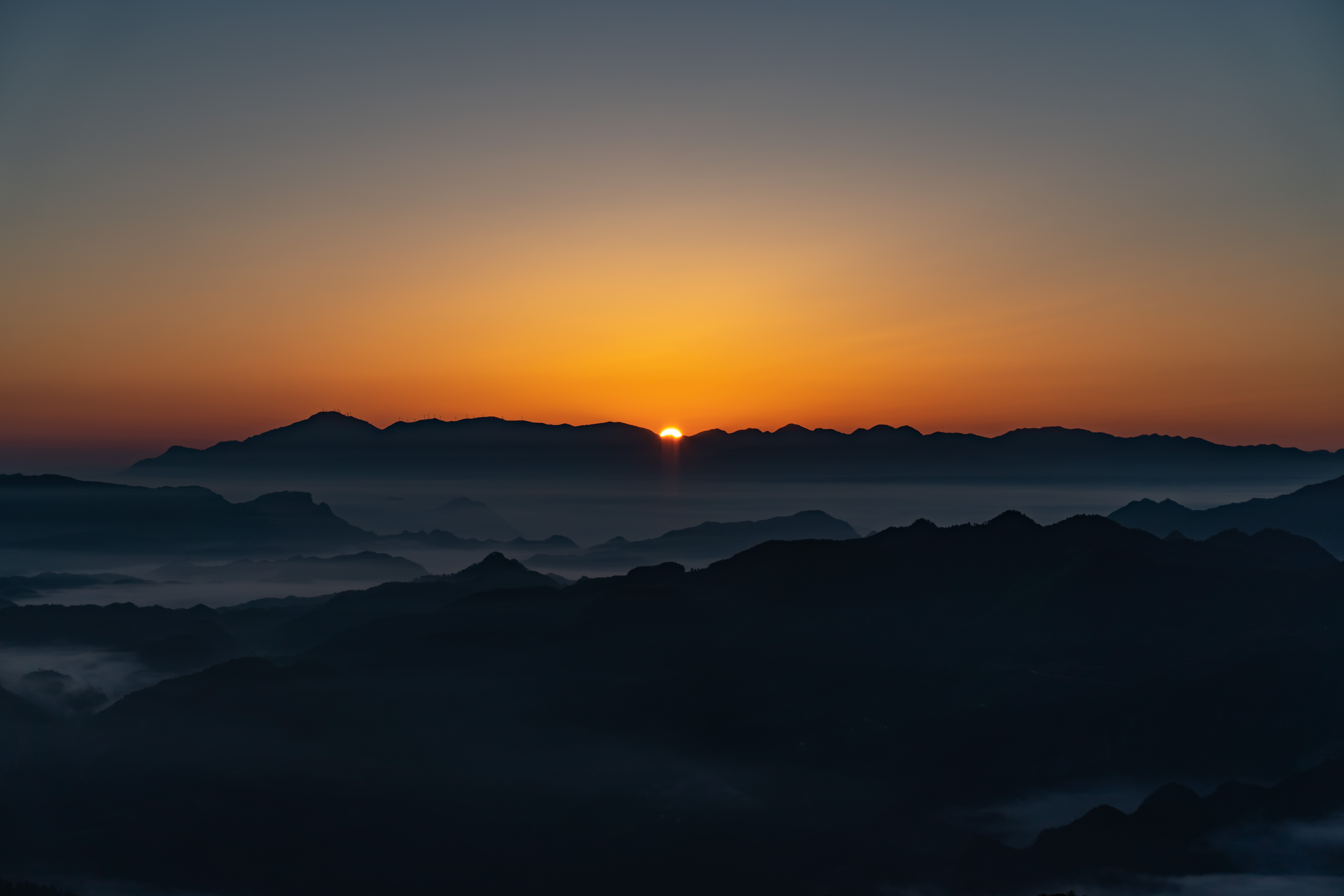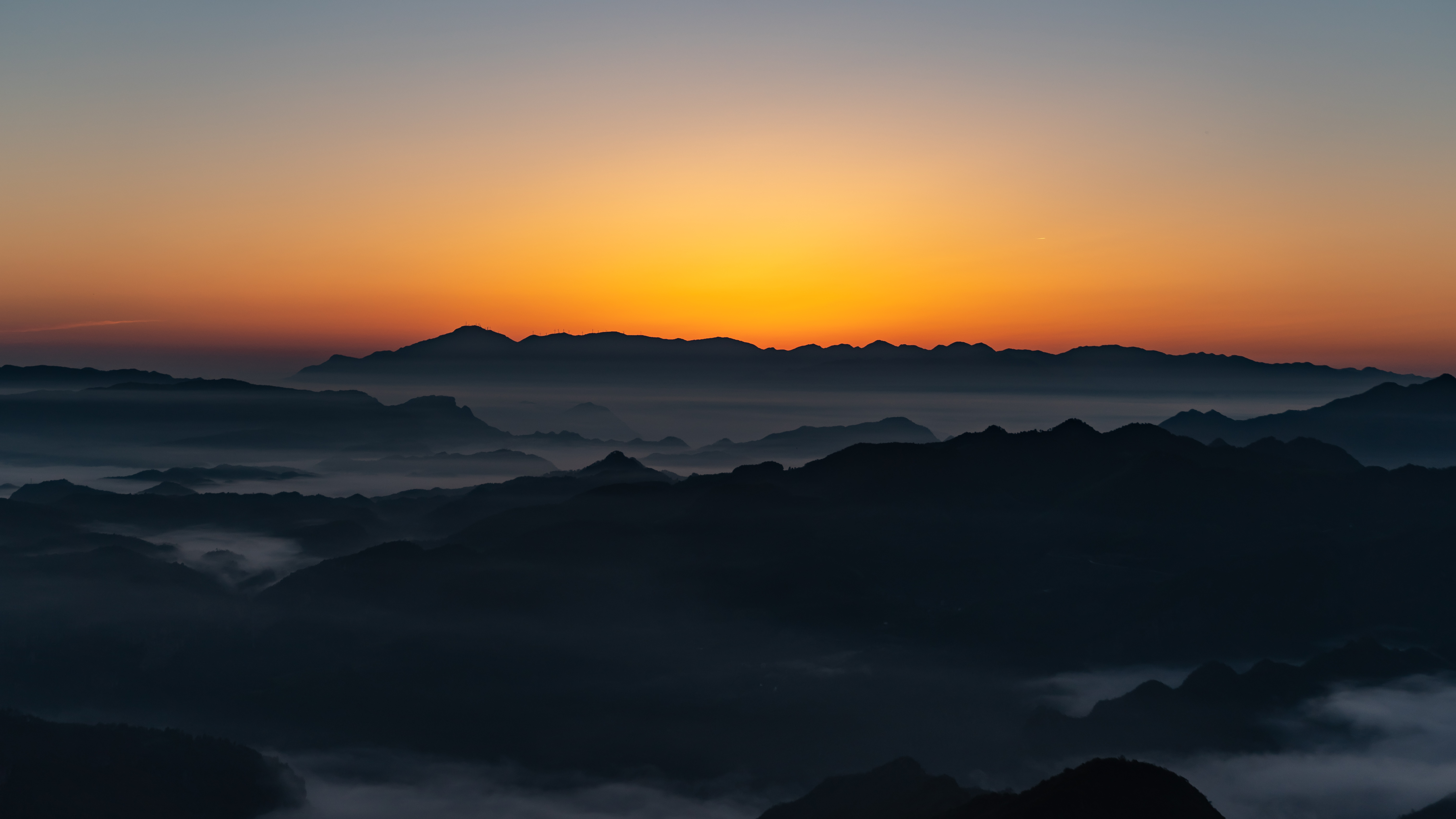 公盂背上的日出,视野极为开阔。山间云雾袅袅,天边橘色与蓝色,既冲突又和谐,带来极其静谧的感觉,仿佛整个人都可以沉在里面。