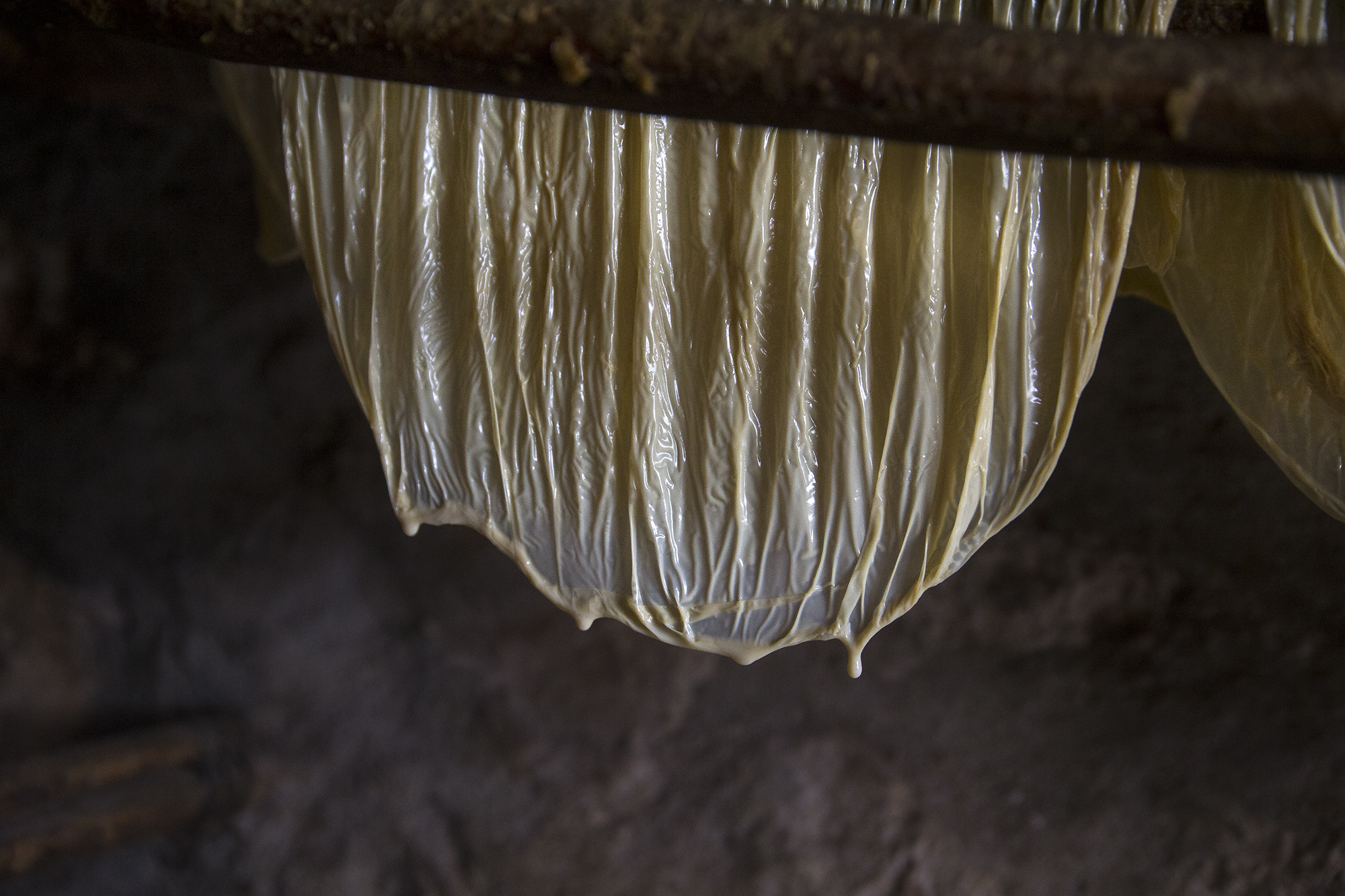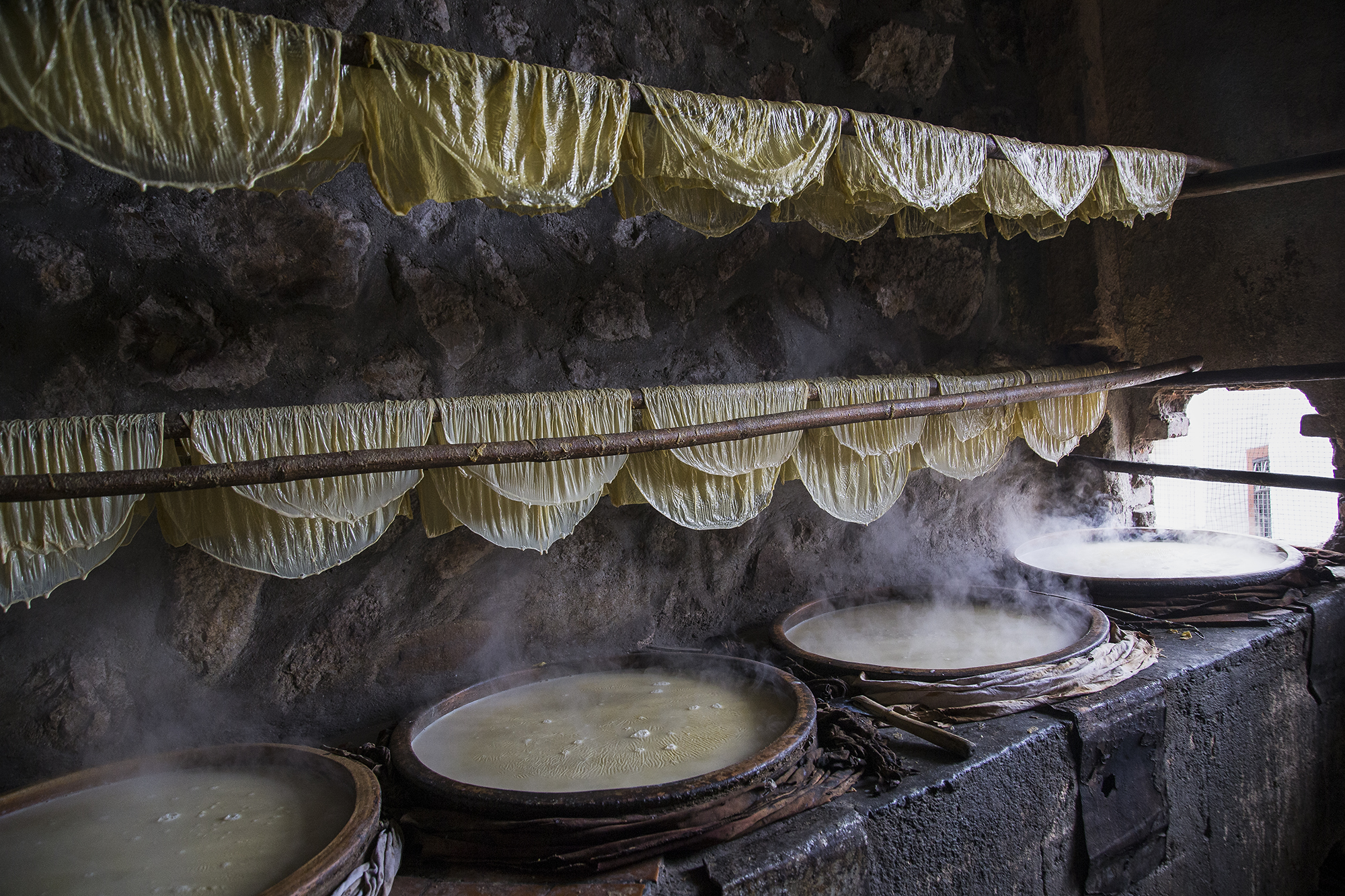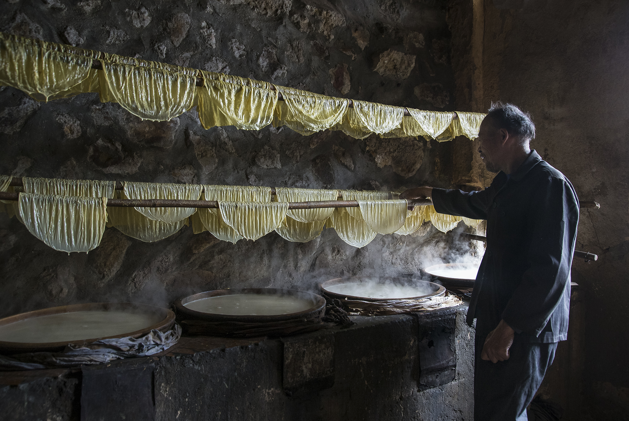 老爷爷跟我们说,每天早上四点起床,烧豆汁,然后等上面凝结成一块后就用特制的铁钩起来晾在锅上面的竹竿上,晒完一锅要12小时,即一直到下午16点才结束。