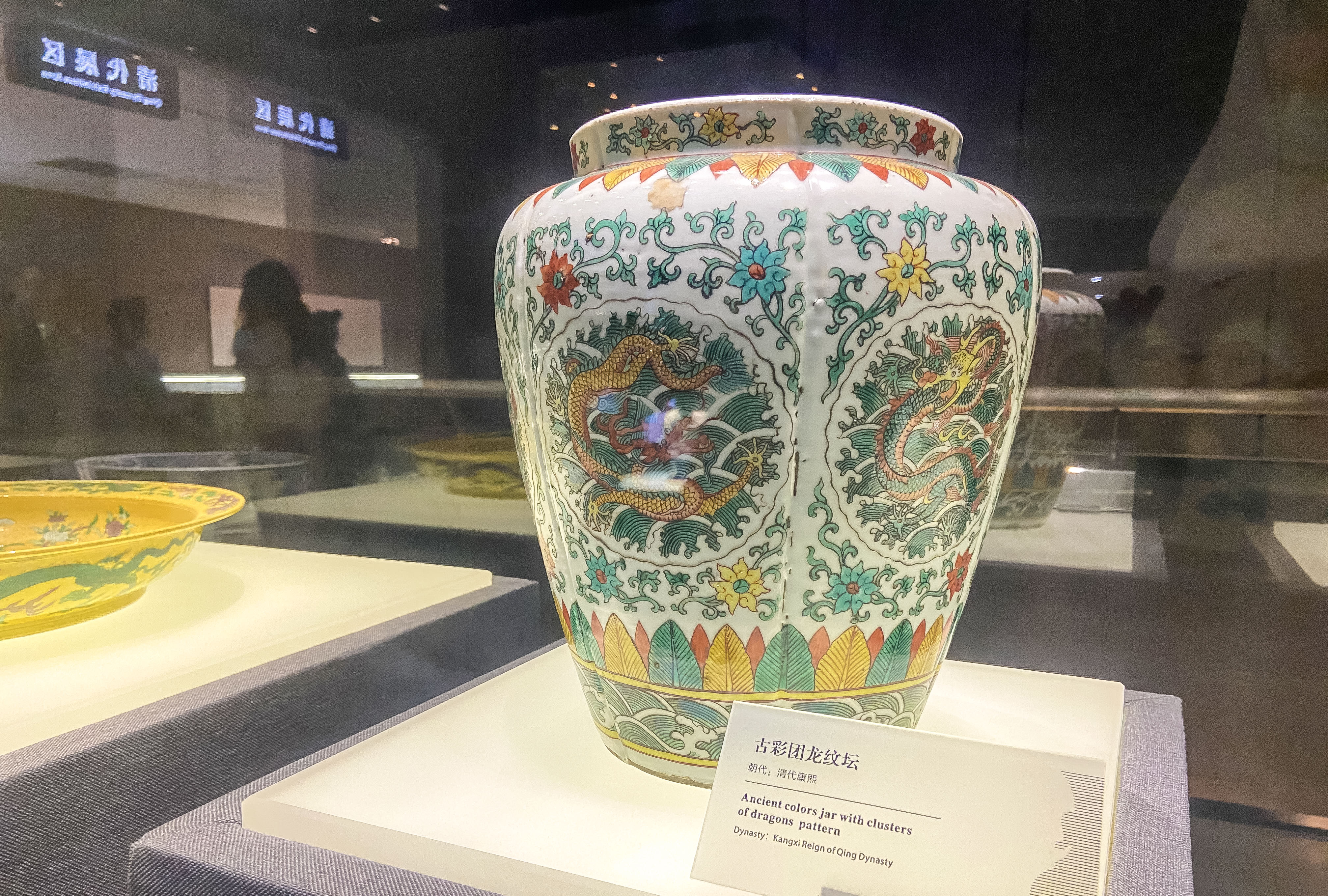 第二展厅主要有以青花、青花斗彩、五彩、红绿彩和颜色釉为主的明代官窑器,这一展厅相比于上一个展厅明显可以感受到制作工艺的进步,瓷器的色彩更加的丰富,很少能看见拼接的碎瓷,瓷器的色彩也保留的很好,虽色相单一,但感觉丰富。