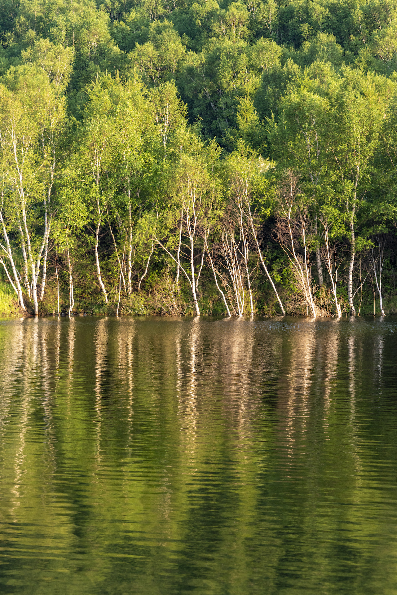 沿着小路来到天镜湖,这片湖泊其实被分为两片,中间由一道水坝隔开。湖边是沿湖漫步的木栈道,一侧湖中还有透明的玻璃栈道。四周一片郁郁葱葱,白桦林似乎就生长在湖水里,风车在山坡上缓缓转动。时值黄昏,黄昏时的天镜湖,平静的湖水、葱郁的森林,还有洁白的风车,都沐浴在一片温暖的金色里,这一刻,仿佛世界都安静了。