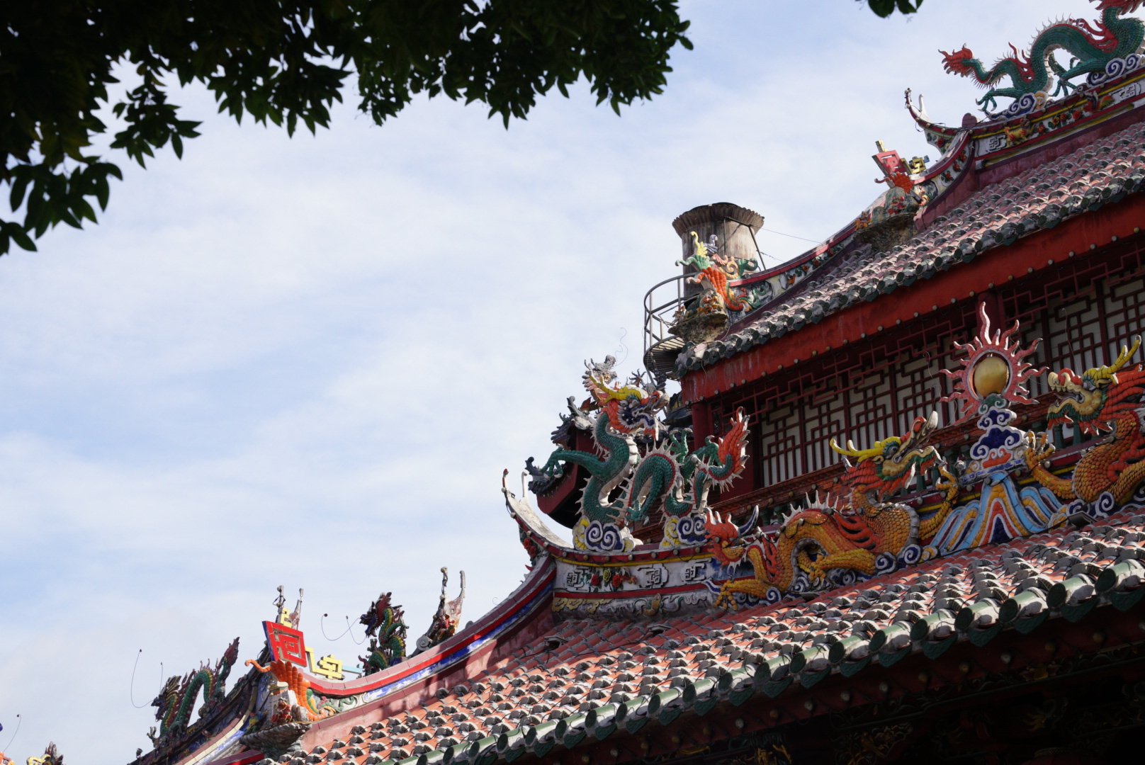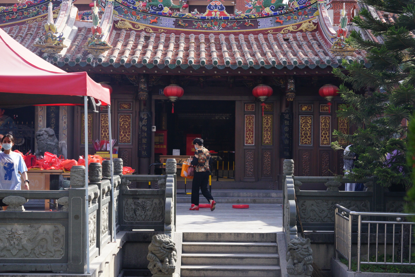 关岳庙整体并不大也就三大殿,整体建筑风格非常繁复热烈,翘起的檐角上雕梁画栋。随手一拍就很有画面感,刚好有个蟳埔阿姨走进画面里,浓浓的闽南人文气息。