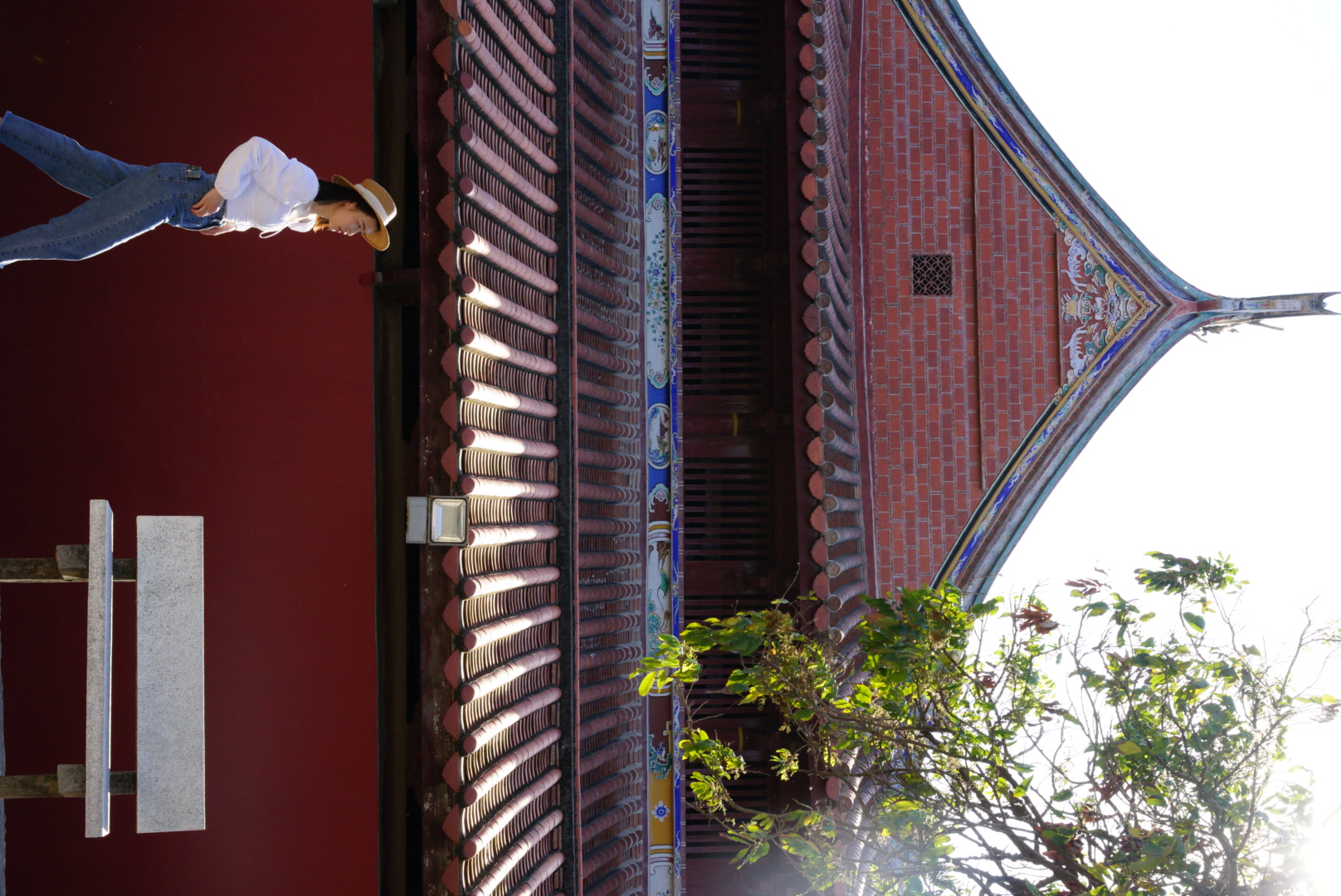 大雄宝殿附近有一面红墙,中间嵌着几扇小圆窗,红砖墙琉璃瓦彩绘屋脊,大场景很是出片!四舍五入就是故宫同款了!