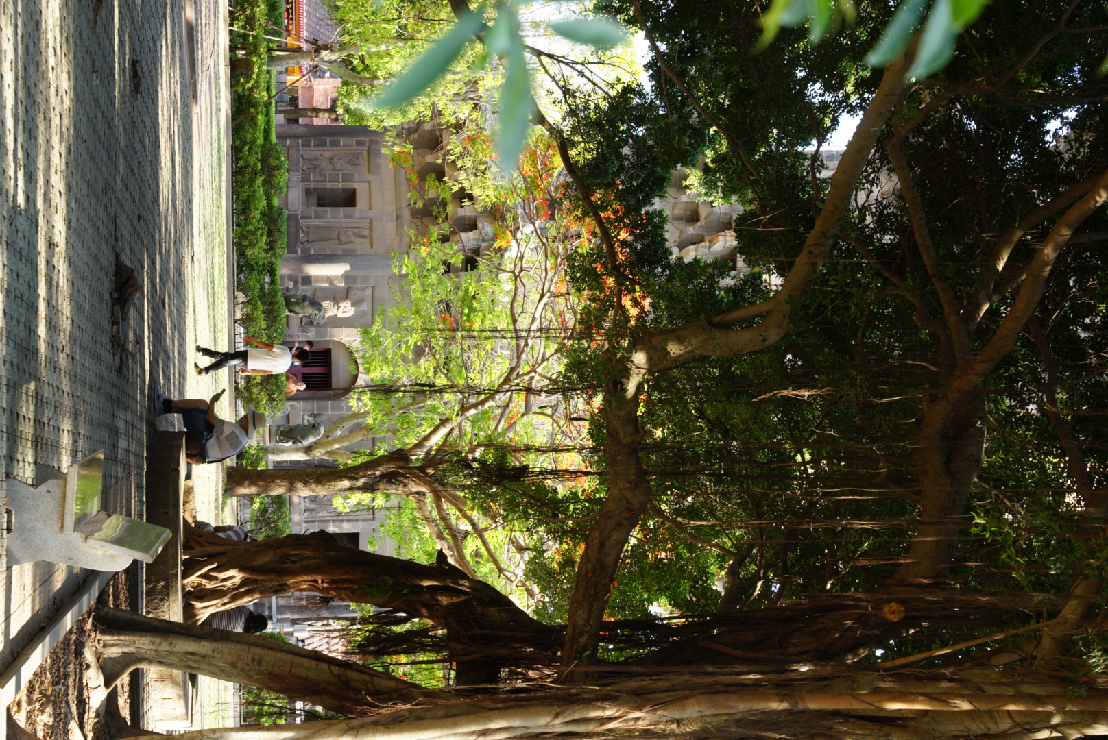 正对大门口是两棵古老的大榕树,树下经常有鸽子群在此等待投食。