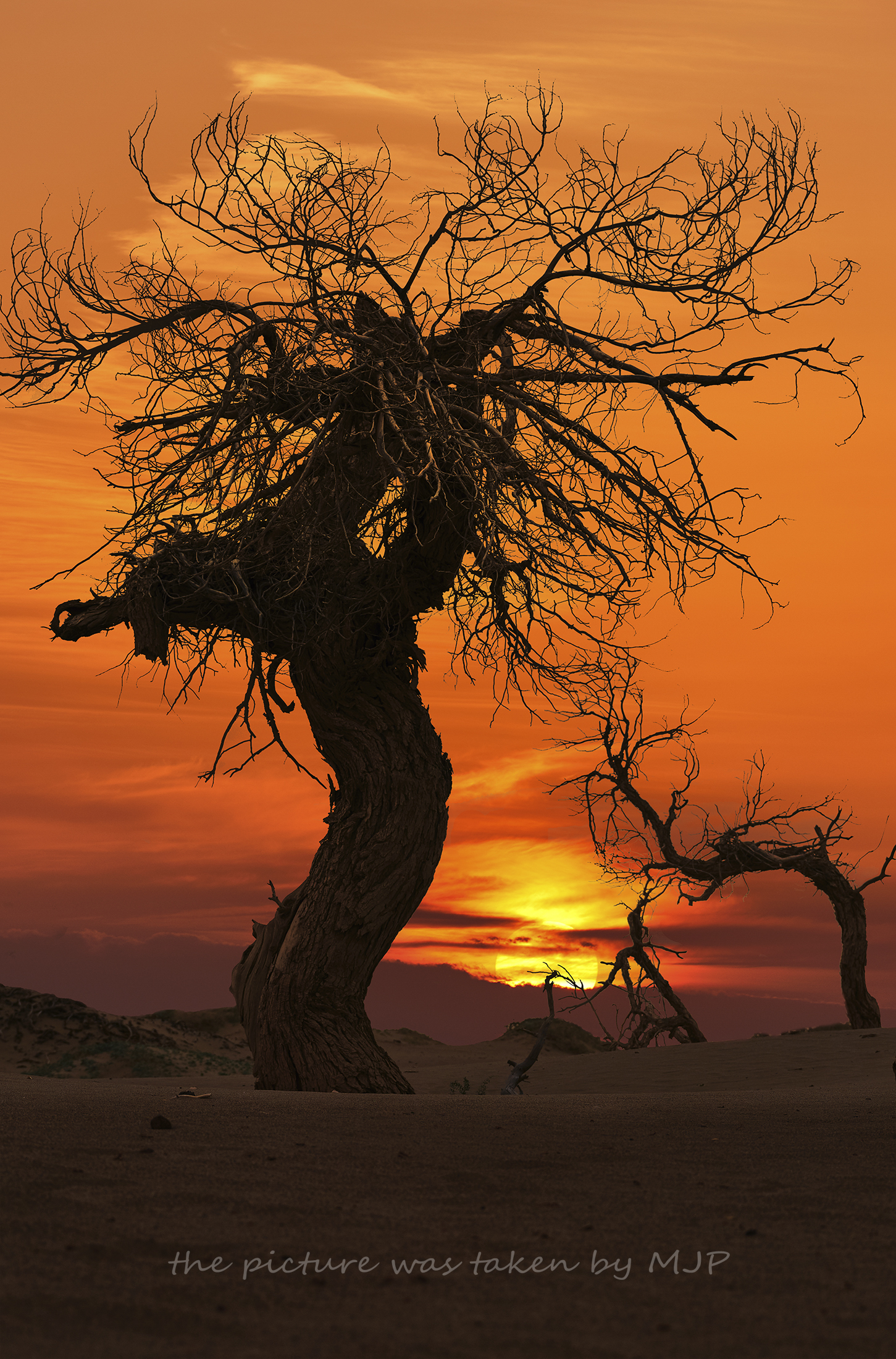 白日的倦去在傍晚,黑夜即将登场。在这白与黑轮值的时候,一定会有一个神秘而又壮丽的仪式。在这个仪式中胡杨不是龙套而是铁定的主角。落日瞬间的胡杨,晚霞尽抹,在天幕中竭力伸展开躯体,用充满无尽张力的铁干虬枝,表达着对生命的执念和渴望。