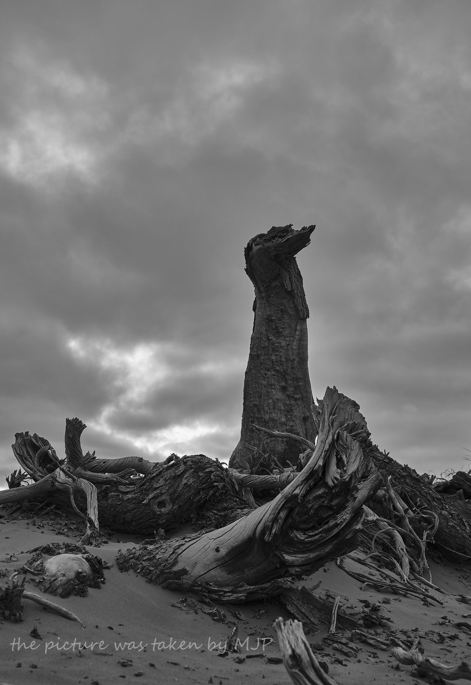 华丽的背后总是艰辛与苦难。如果你走到沙漠深处,突变的画风、强烈的反差会让人惊悚甚至恐惧。那是一种无边无际的沧桑和悲怆,这种感觉弥漫心头凝重得让人一时迈不开步。刚才还是一片绚烂,蓝天白云黄叶交相辉映,美得让人心醉。现在却是入目凄惨,树干皴裂又大又深,枝条干枯扭曲。地上横七竖八,枯死的胡杨陈骸漠野。这是遭受了怎么样的磨难又经历了怎么样的抗争才能留下这么一番悲壮的景象啊。