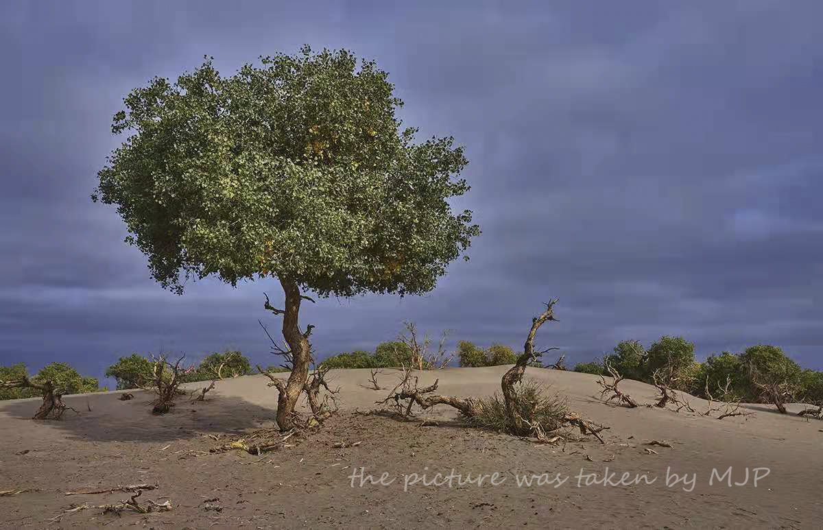 见过胡杨的辉煌与苦难,所有人会被他的风骨所惊呆所慑服。相信就此脑海中会永远地刻下胡杨的印象:苍干遒劲,傲骨嶙峋。形态不羁而任性,颜色斑斓而堂皇。不畏严寒高温,不惧盐碱风沙,既虚怀若谷又唯我独尊,既傲视众生又为众生遮风挡沙。在大漠的日升日落中默默地注视着沧海桑田的变幻,孤独地历经无情岁月的轮回。餐沙茹碱,炎炙寒冻,修成近万年的道行,生而三千年不死,死而三千年不倒,倒而三千年不朽。活着,为沙漠增加一道美丽的风景;死了,用骸骨挡住风沙对绿洲的侵袭。巍巍风貌铮铮铁骨,让人感叹,油然而生膜拜之情。