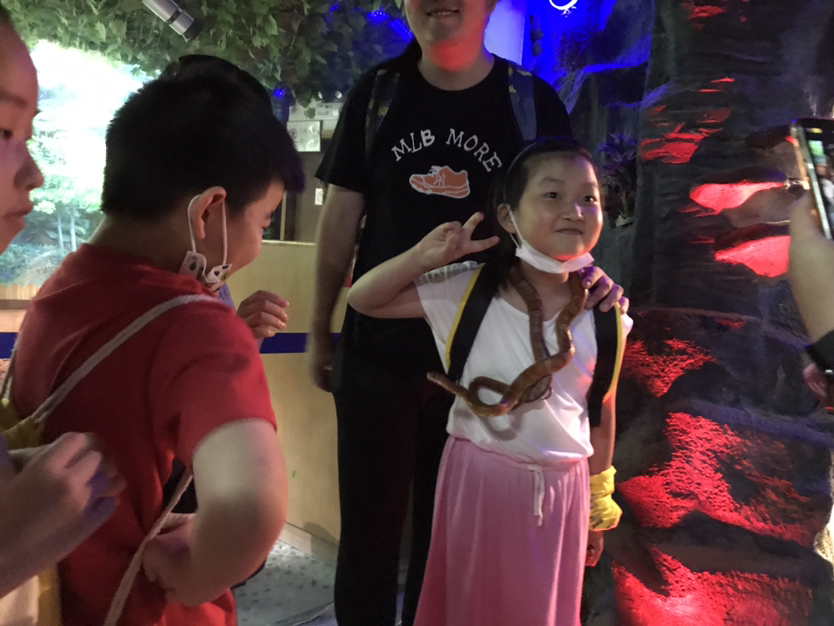 让小朋友兴奋的环节,大自然中的冷血杀手,动物界最炫的蟒蛇。第一个看到是黄金蟒,因缺少黑色素,皮肤表面白化颜色,它的性格很温驯,不会主动攻击人,抵抗不住小朋友惊恐又想触摸的心情。