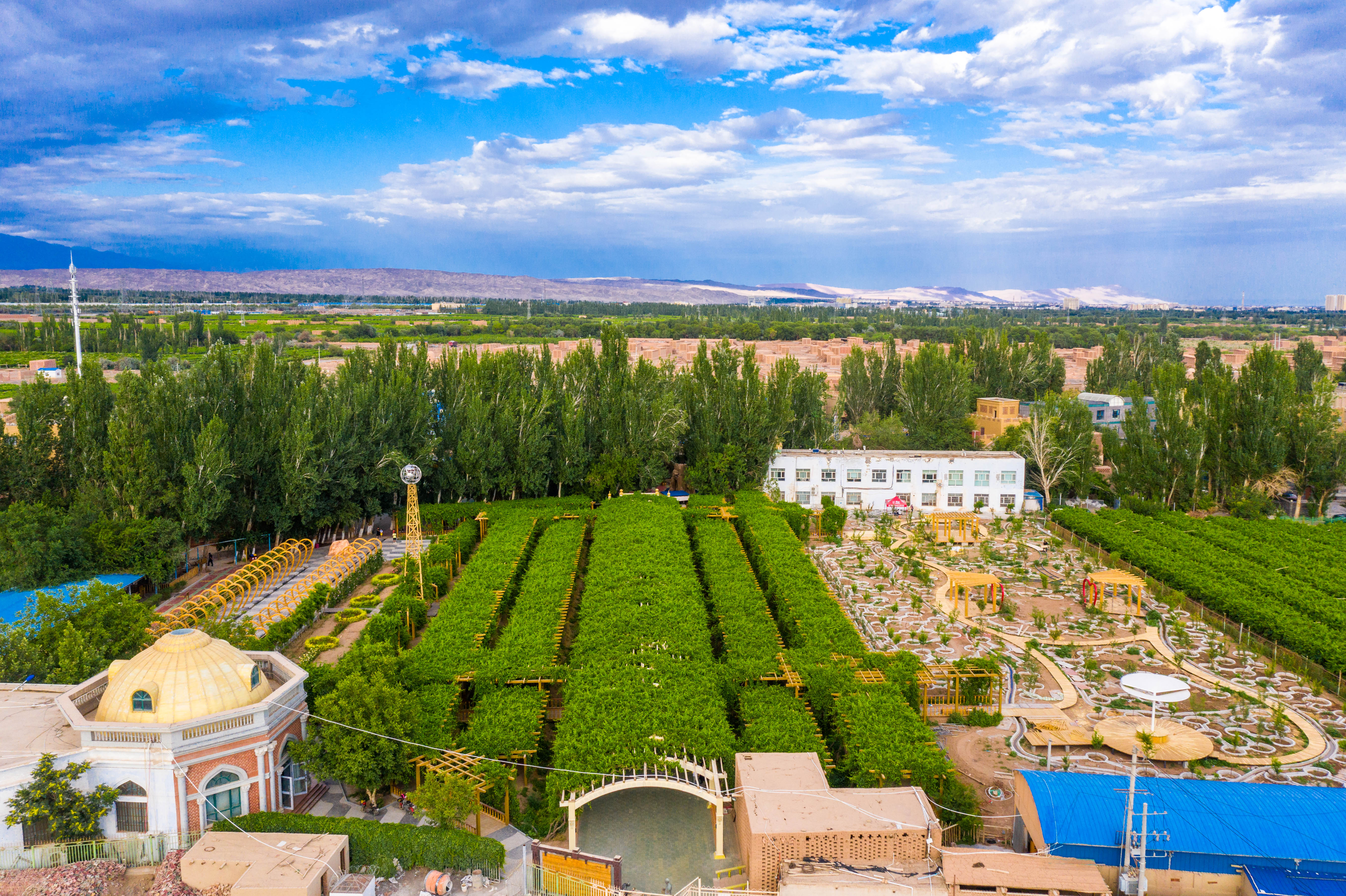 在吐鲁番,随处可见葡萄园。坎儿井乐园的葡萄园非常有特色,这里有大型葡萄长廊和水休闲生态葡萄园,长在长廊下,抬头就是盘满的葡萄,长廊的葡萄藤上结下品种多样,琳琅满目的水晶般的各种葡萄。