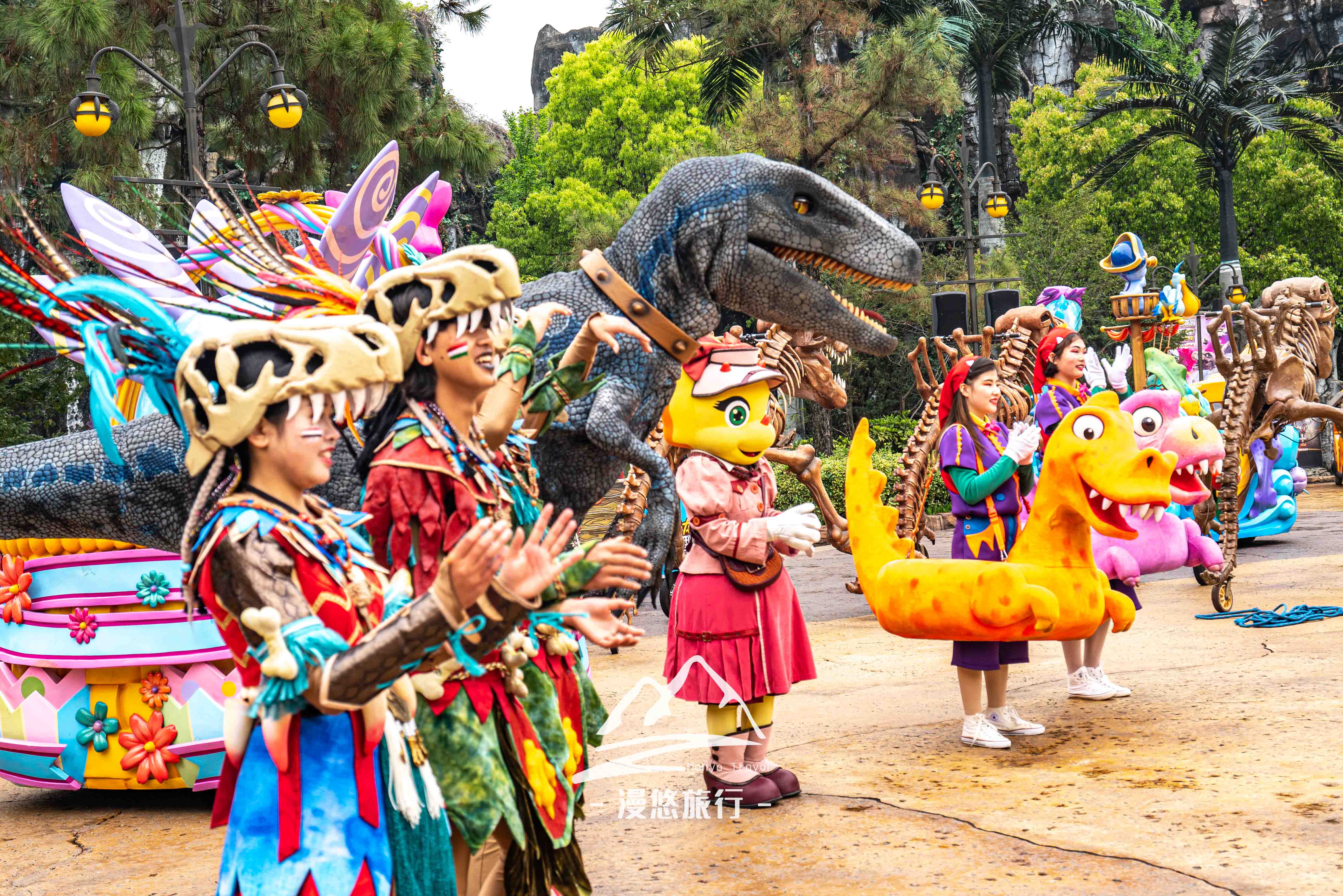 在园里漫步一圈,你会发现到处都是恐龙的身影,就连演职人员骑着走的也是恐龙,看这招摇过街的画面,太美了。